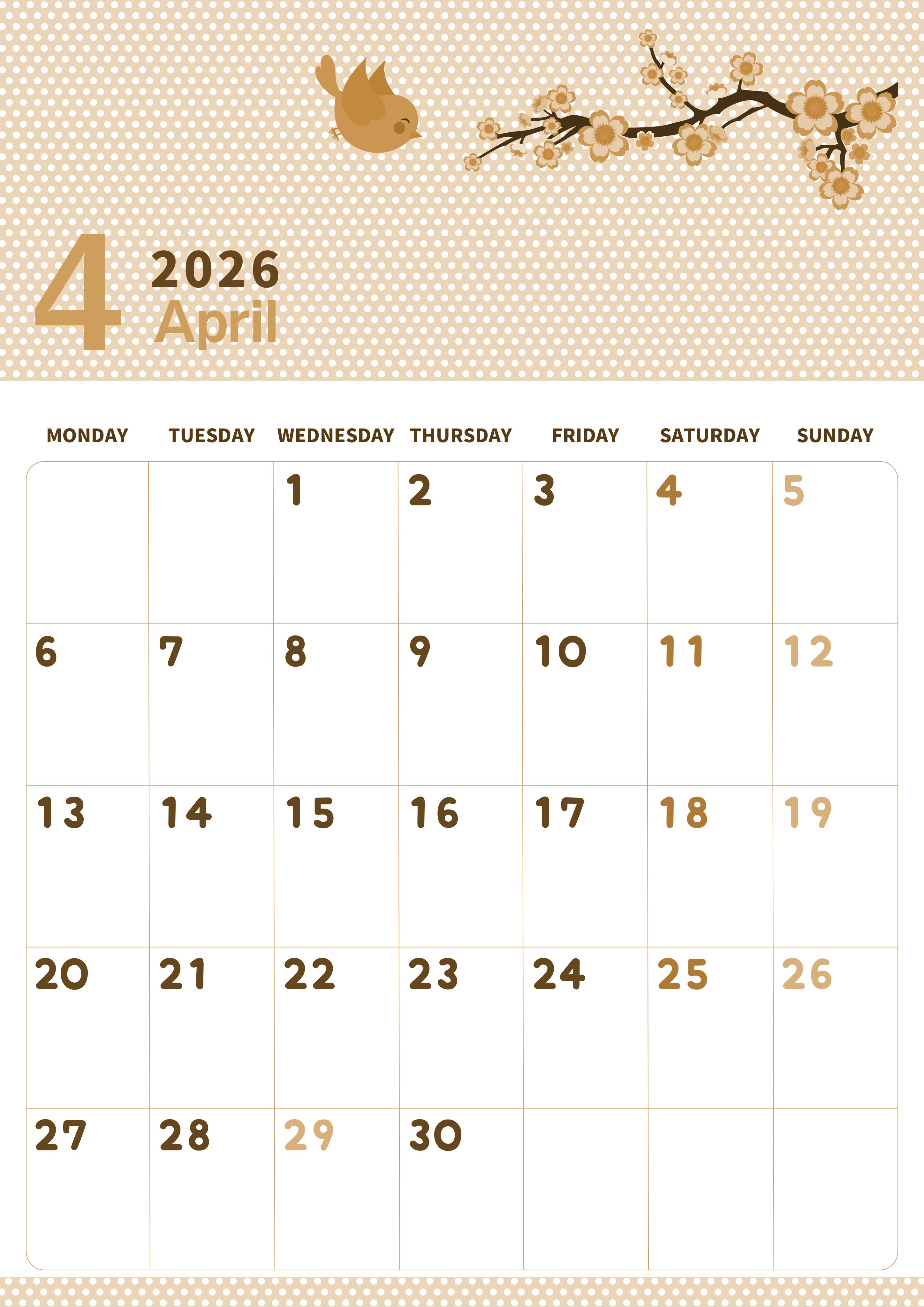 2026年4月縦型レトロな月曜始まりの無料テンプレートセピア調カレンダーです。ウグイスのイラストが愛らしくかわいいセピア調カレンダーです。縦型でたっぷりとスケジュールを書き込める有用なフリー素材です。(2026-00580411)