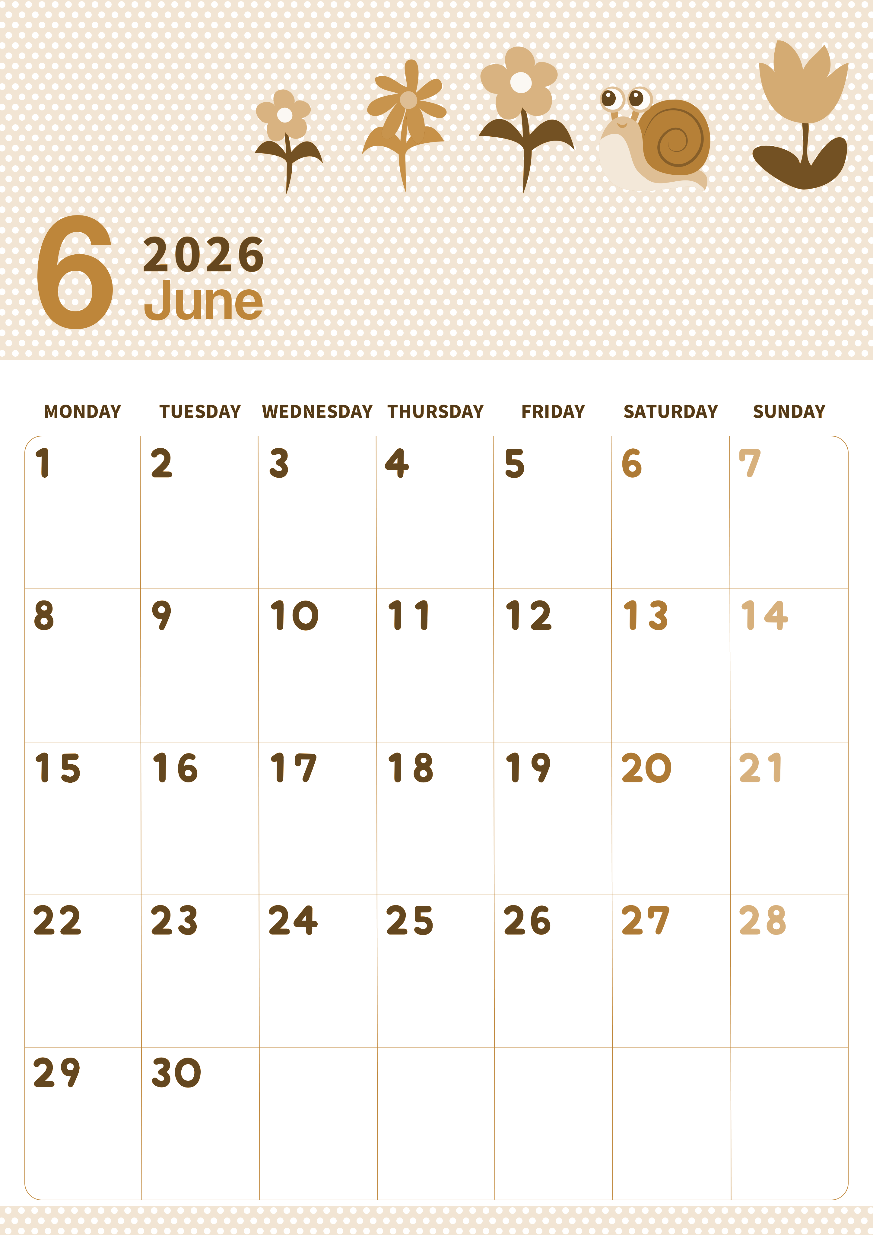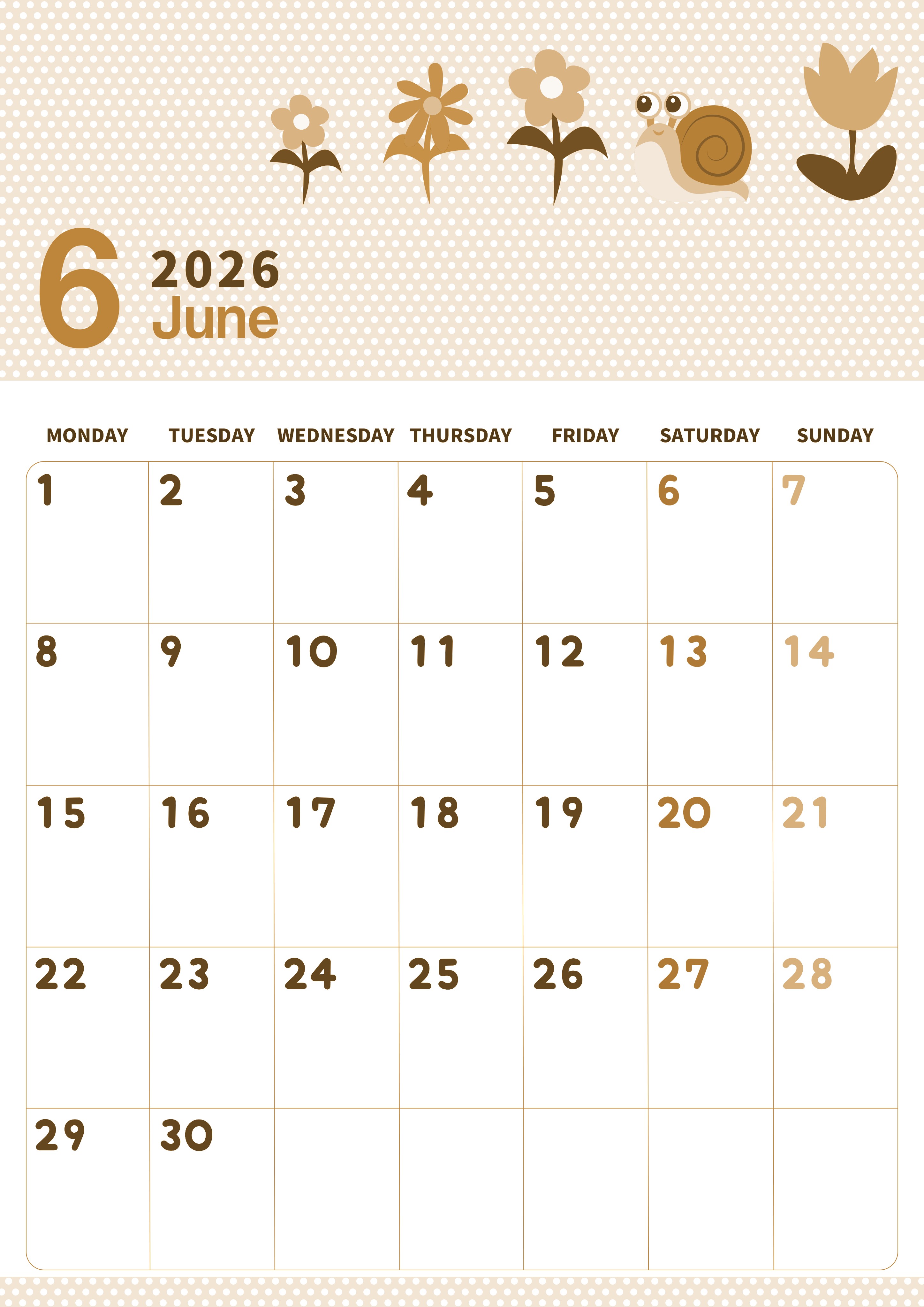 2026年6月縦型レトロな月曜始まりの無料テンプレートセピア調カレンダーです。月曜始まりセピア調カレンダー慣れしている人は必見のフリー素材です。セピア調カレンダーエリアはゆとりがあって使いやすいのはもちろん、カタツムリのイラストもおしゃれです。(2026-00580611)