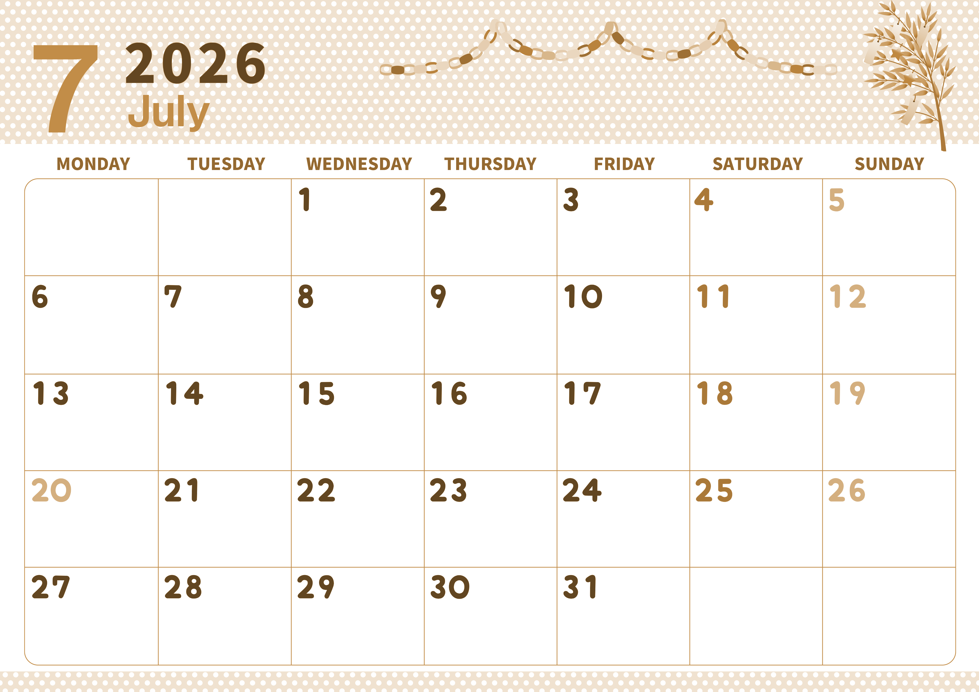 2026年7月横型レトロな月曜始まりの無料テンプレートセピア調カレンダーです。月曜始まりセピア調カレンダーを求めているのであればダウンロードを推奨します。輪飾りのイラストが上部に施されていて全体的にシンプルでありながらもかわいいです。(2026-00580701)