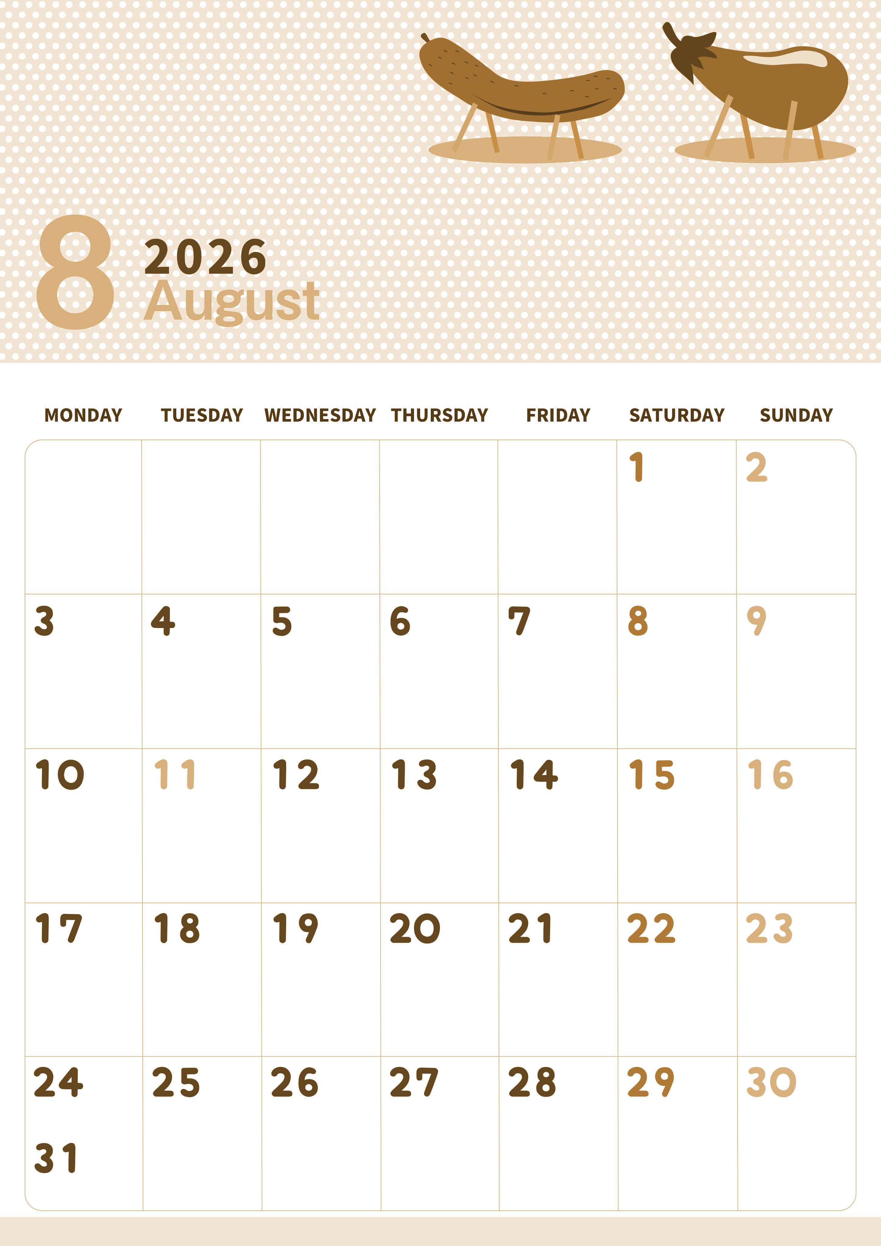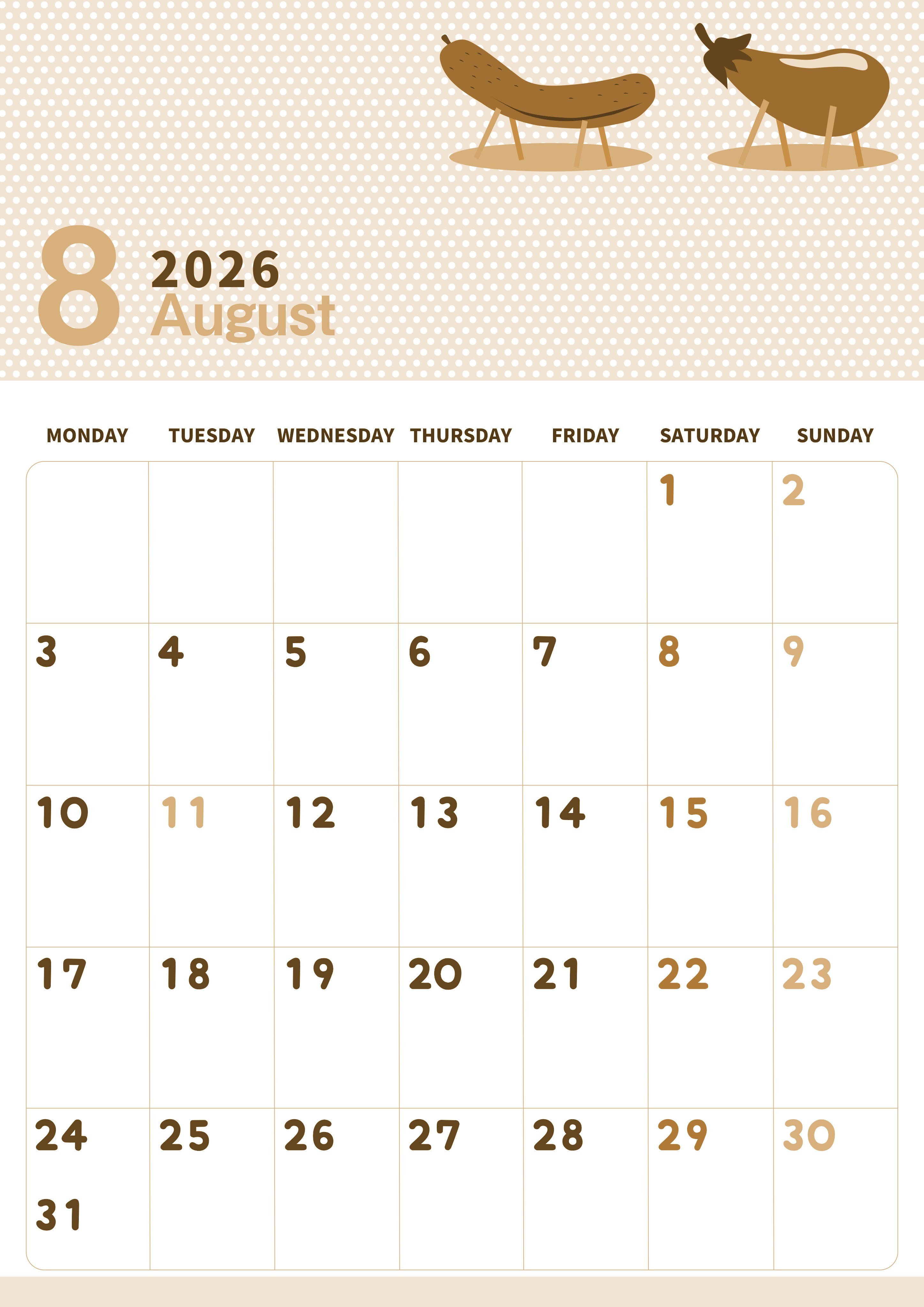 2026年8月縦型レトロな月曜始まりの無料テンプレートセピア調カレンダーです。風物詩の野菜をモチーフにしたイラストが背景に映えてかわいい月曜始まりの曜日ごとに文字が色分けされているタイプのセピア調カレンダーです。(2026-00580811)