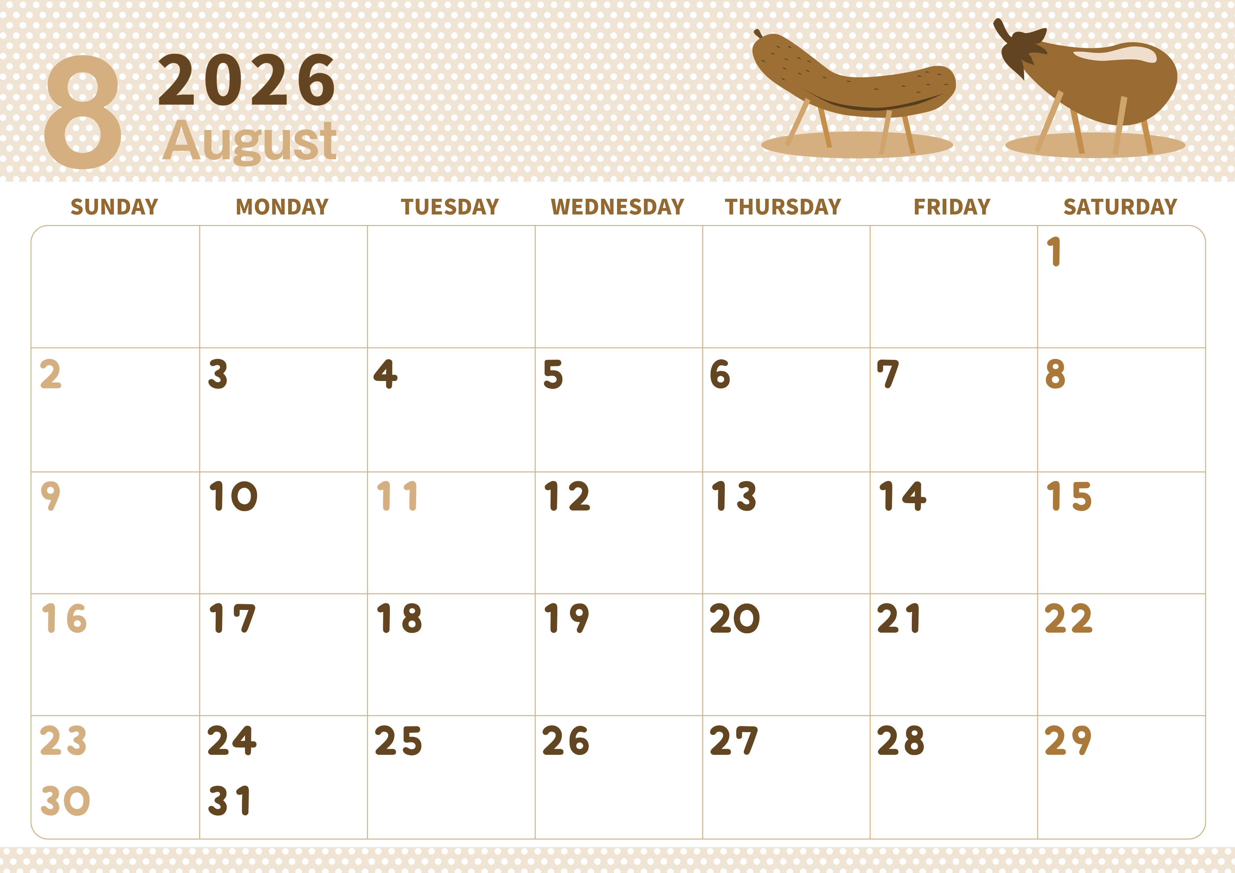 2026年8月横型レトロな日曜始まりの無料テンプレートセピア調カレンダーです。きゅうりやなすびの野菜イラストがシンプルでかわいいセピア調カレンダーは休みや仕事の管理がしやすい使い勝手の良いフォーマットです。(2026-00580800)