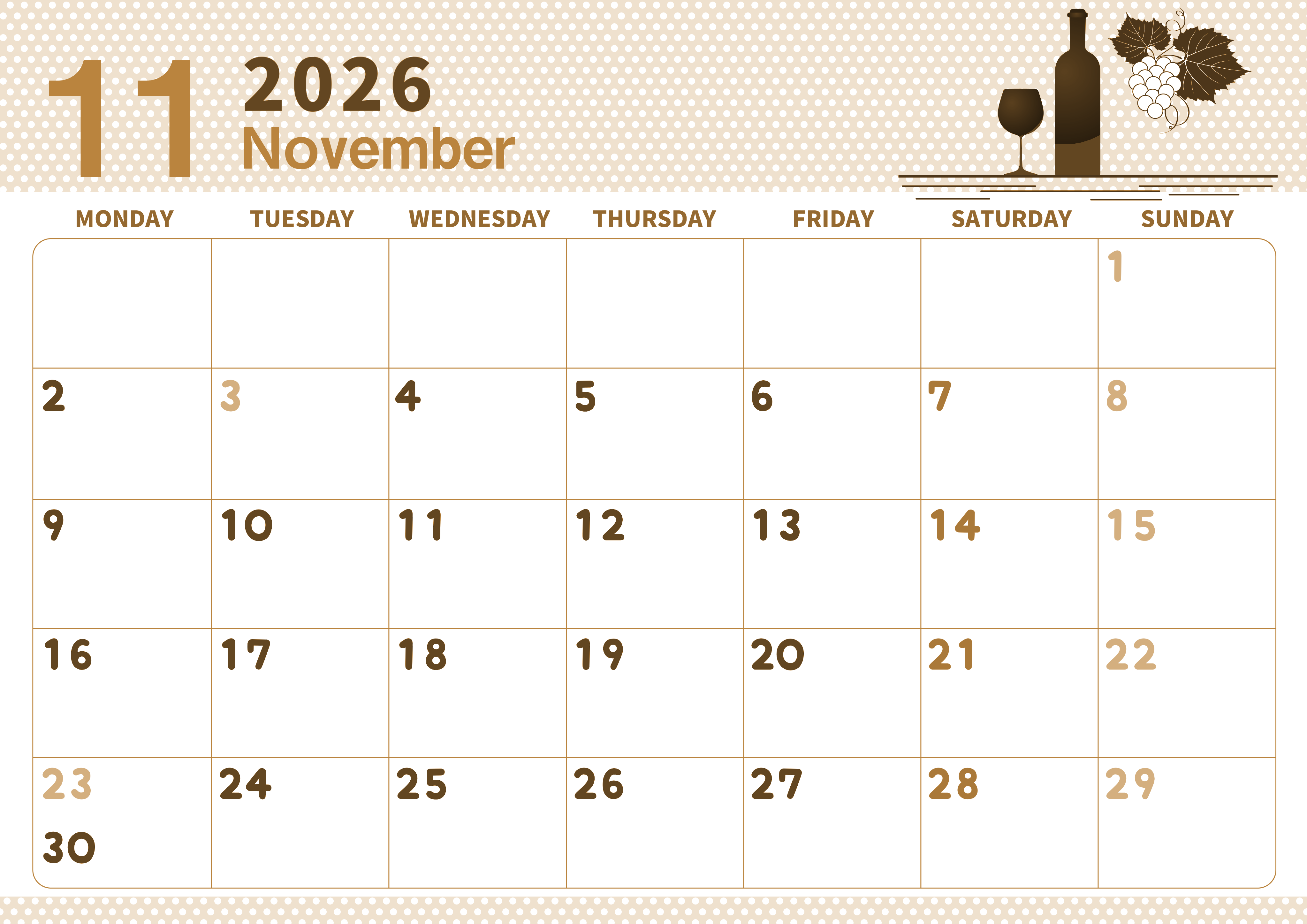 2026年11月横型レトロな月曜始まりの無料テンプレートセピア調カレンダーです。ワイン好きな人におすすめをしたいイラストセピア調カレンダーです。おしゃれテイストで月曜始まりなのでタスク管理のしやすさに長けています。(2026-00581101)