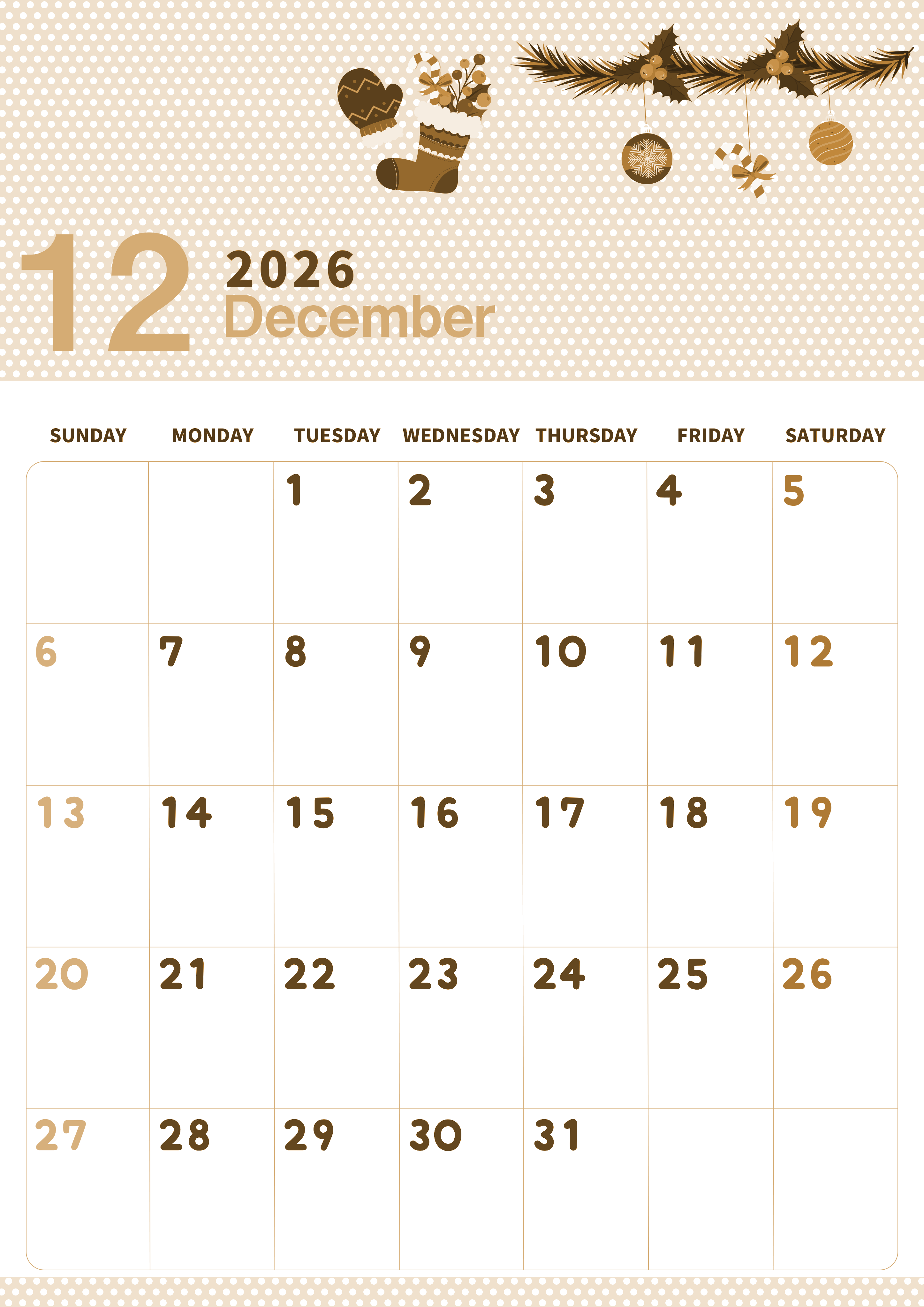 2026年12月縦型レトロな日曜始まりの無料テンプレートセピア調カレンダーです。白いドットが施されている背景にクリスマスモチーフのイラストをふんだんに描いたおしゃれテイストなセピア調カレンダーです。(2026-00581210)