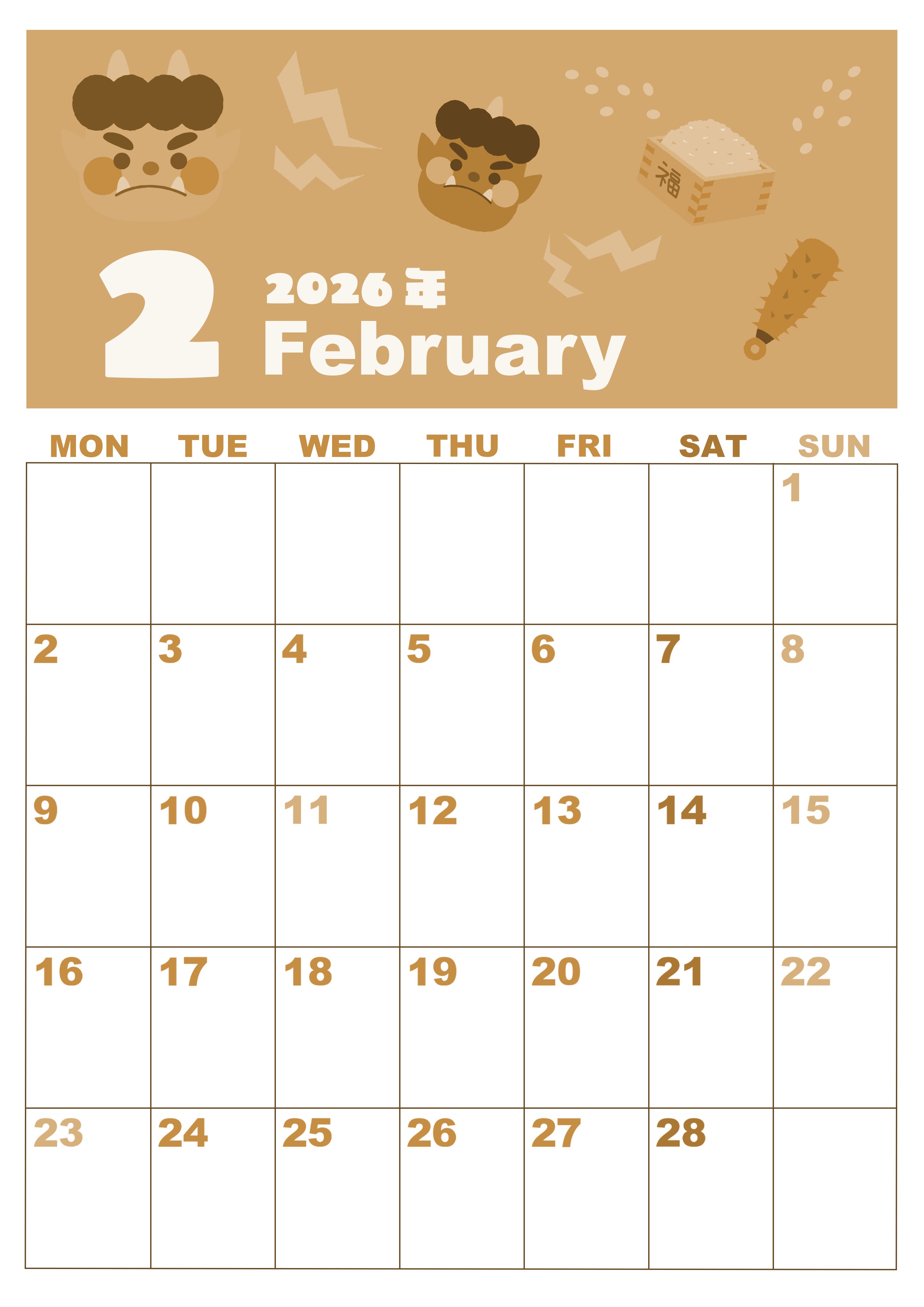 2026年2月縦型レトロな月曜始まりの無料テンプレートセピア調カレンダーです。月曜始まりのセピア調カレンダーが使いやすいという人にとって最適な素材なのでダウンロードをおすすめします。イラストは赤鬼と青鬼と金棒でかわいいです。(2026-00590211)
