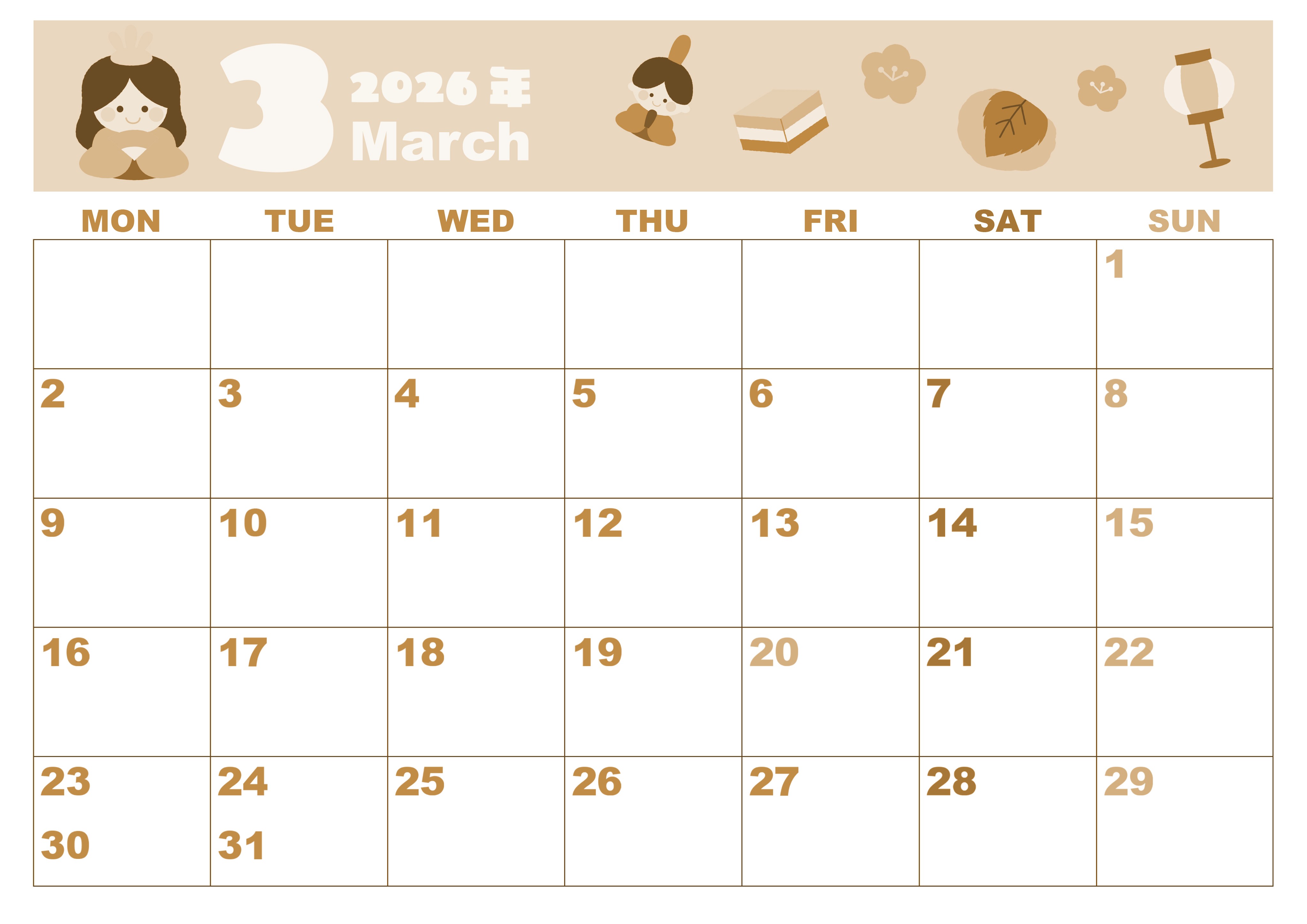 2026年3月横型レトロな月曜始まりの無料テンプレートセピア調カレンダーです。月曜始まりのガーリーなかわいいセピア調カレンダーです。イラストはスケジュール記入欄を避けて描いているので予定を書き込みしやすいです。(2026-00590301)