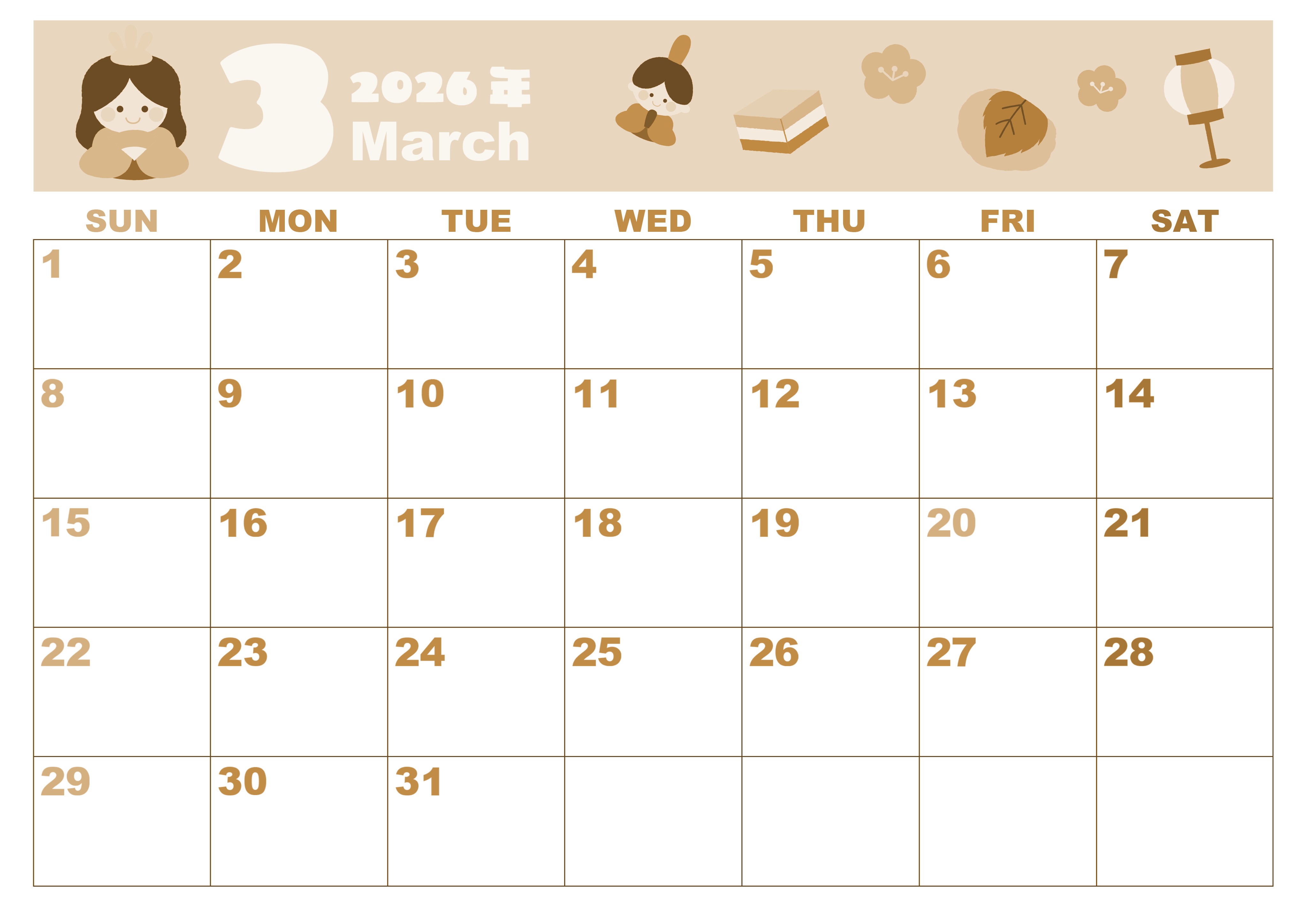 2026年・無料のカレンダーテンプレート 2026年3月横型レトロな日曜始まり ぼんぼりイラストのかわいいA4無料セピア調カレンダー(2026-00590300) 素材状デザイン王 2025年4月2日 2026年3月横型レトロな日曜始まりの無料テンプレートセピア調カレンダーです。柔らかい春の訪れを感じる丸みを帯びたかわいいイラストがたっぷりの無料セピア調カレンダーです。(2026-00590300) 3月 横型のカレンダー 日曜始まり セピア カレンダーデザイン-0059