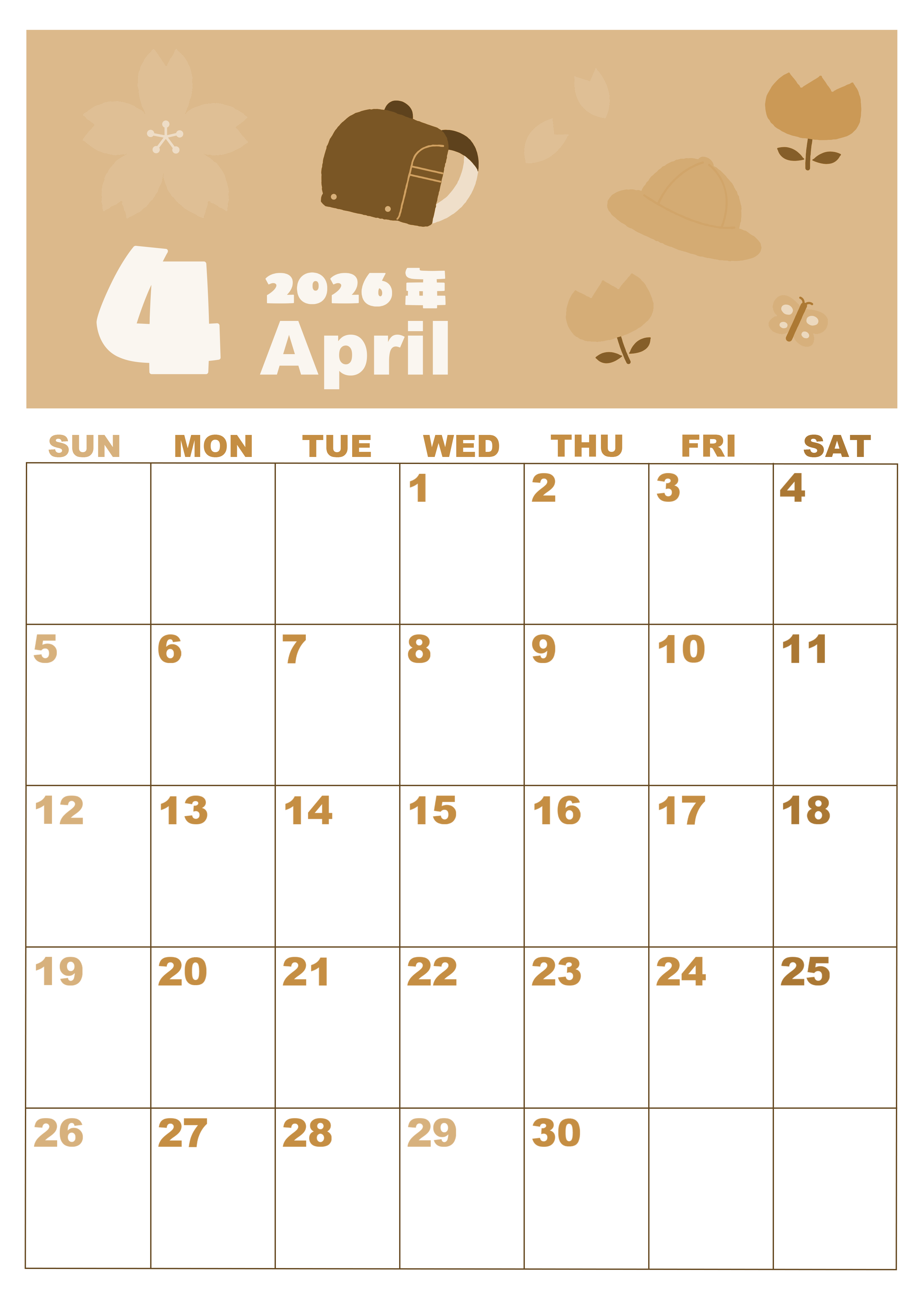 2026年4月縦型レトロな日曜始まりの無料テンプレートセピア調カレンダーです。元気な子供たちを連想させるようなかわいいランドセルのイラストが付いたセピア調カレンダーです。家族でのスケジュール把握に適しているフリー素材です。(2026-00590410)
