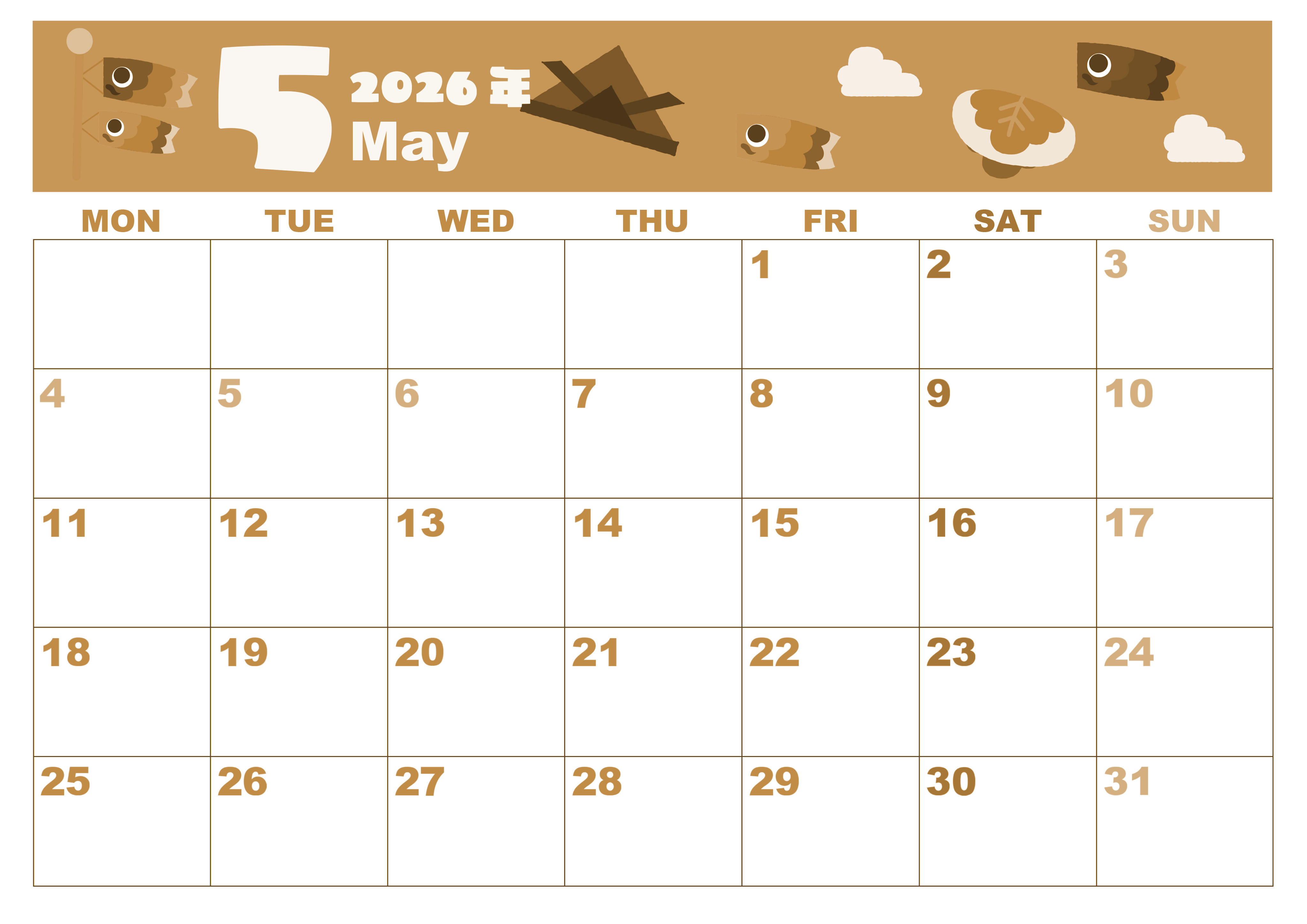 2026年5月横型レトロな月曜始まりの無料テンプレートセピア調カレンダーです。くりくりとした目の鯉のぼりが飛翔していたりと5月の行事の世界観が満載のかわいいセピア調カレンダー素材は無料でダウンロード可能です。(2026-00590501)