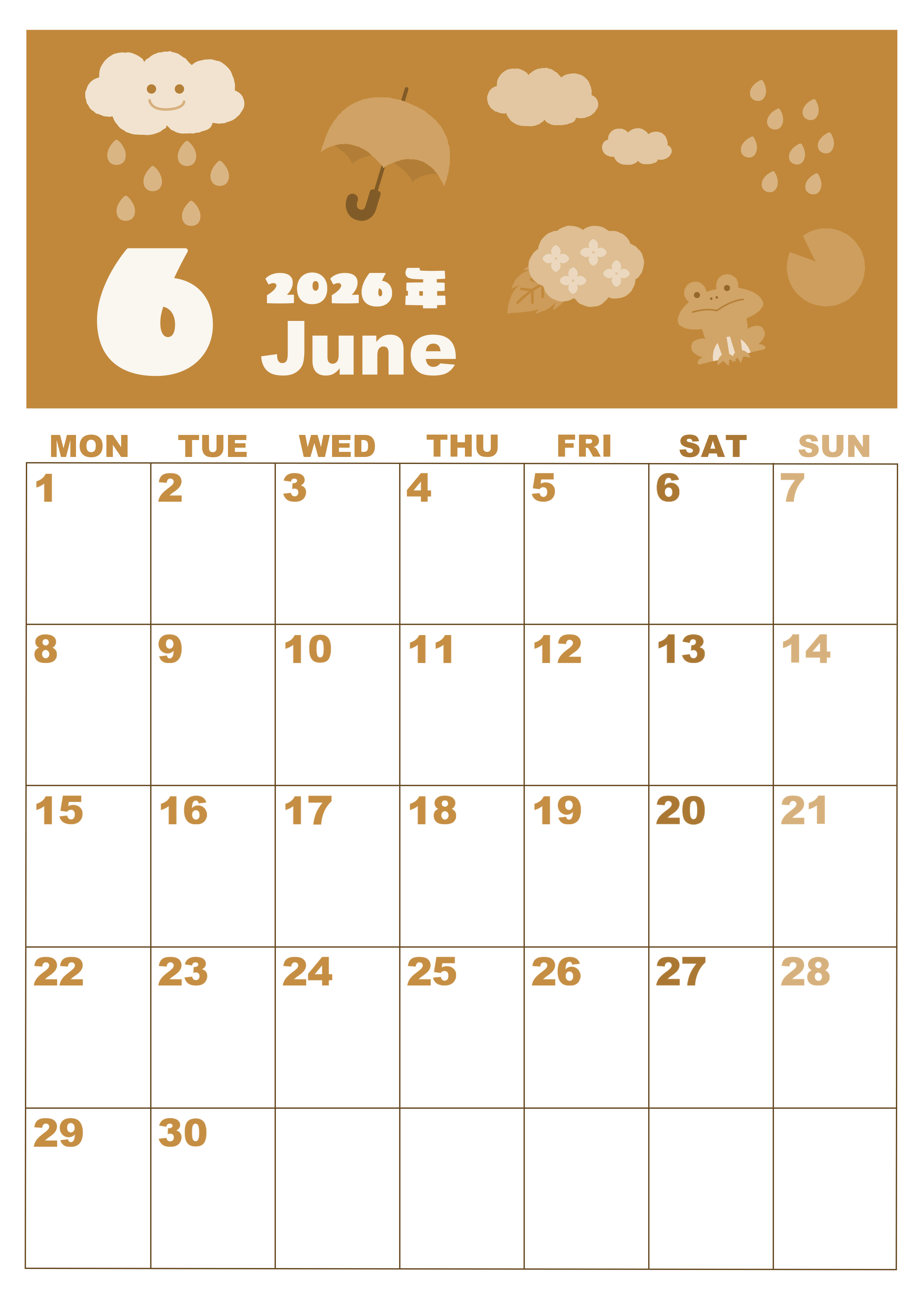 2026年6月縦型レトロな月曜始まり 雨イラストのかわいいA4無料セピア調カレンダー(2026-00590611)