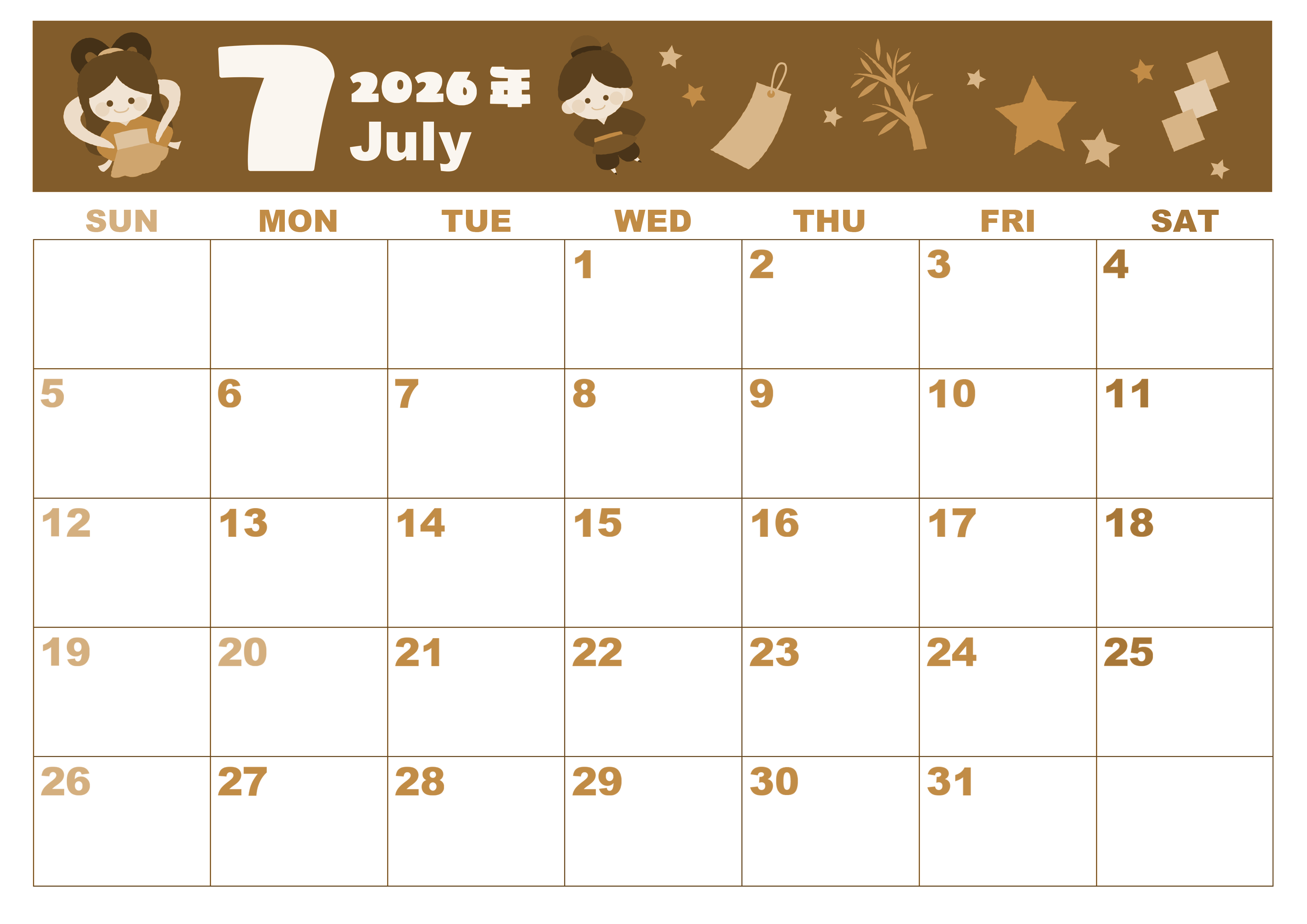 2026年7月横型レトロな日曜始まり 織姫彦星イラストのかわいいA4無料セピア調カレンダー(2026-00590700)