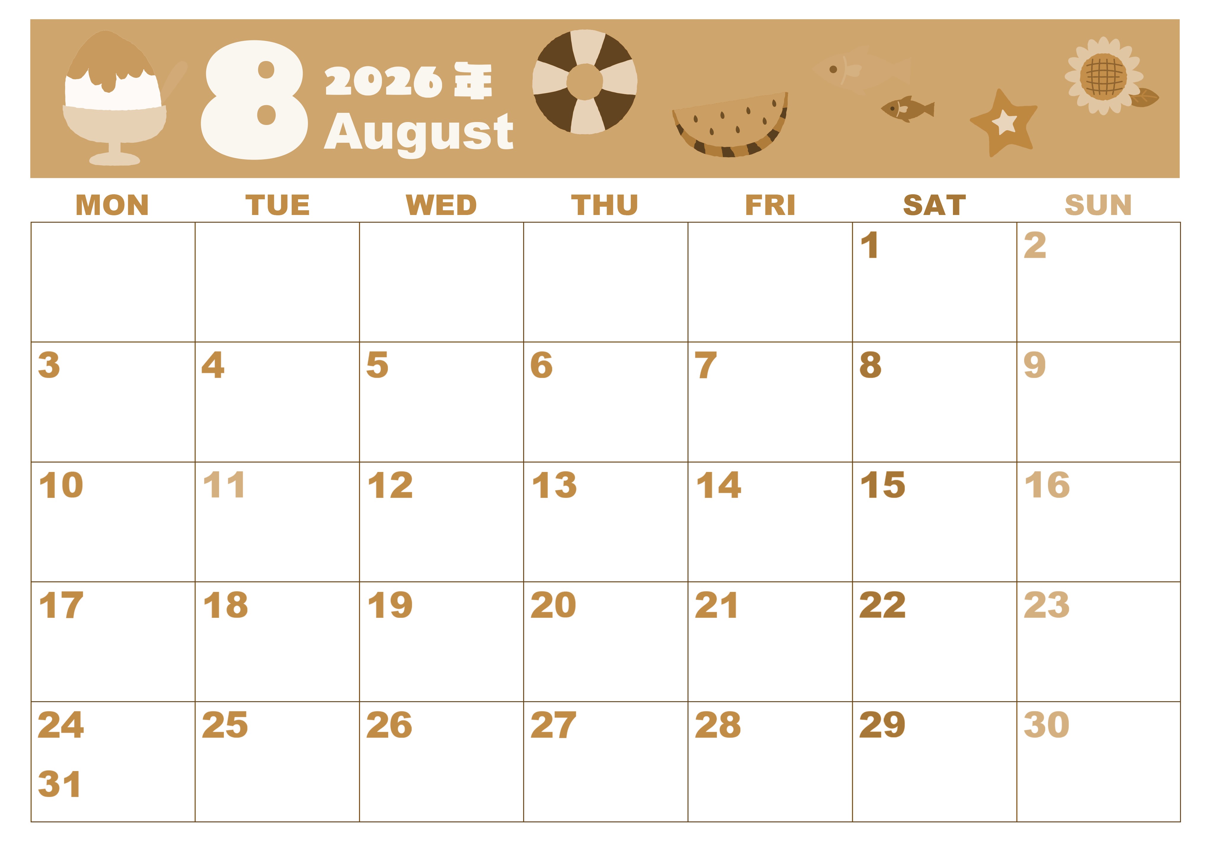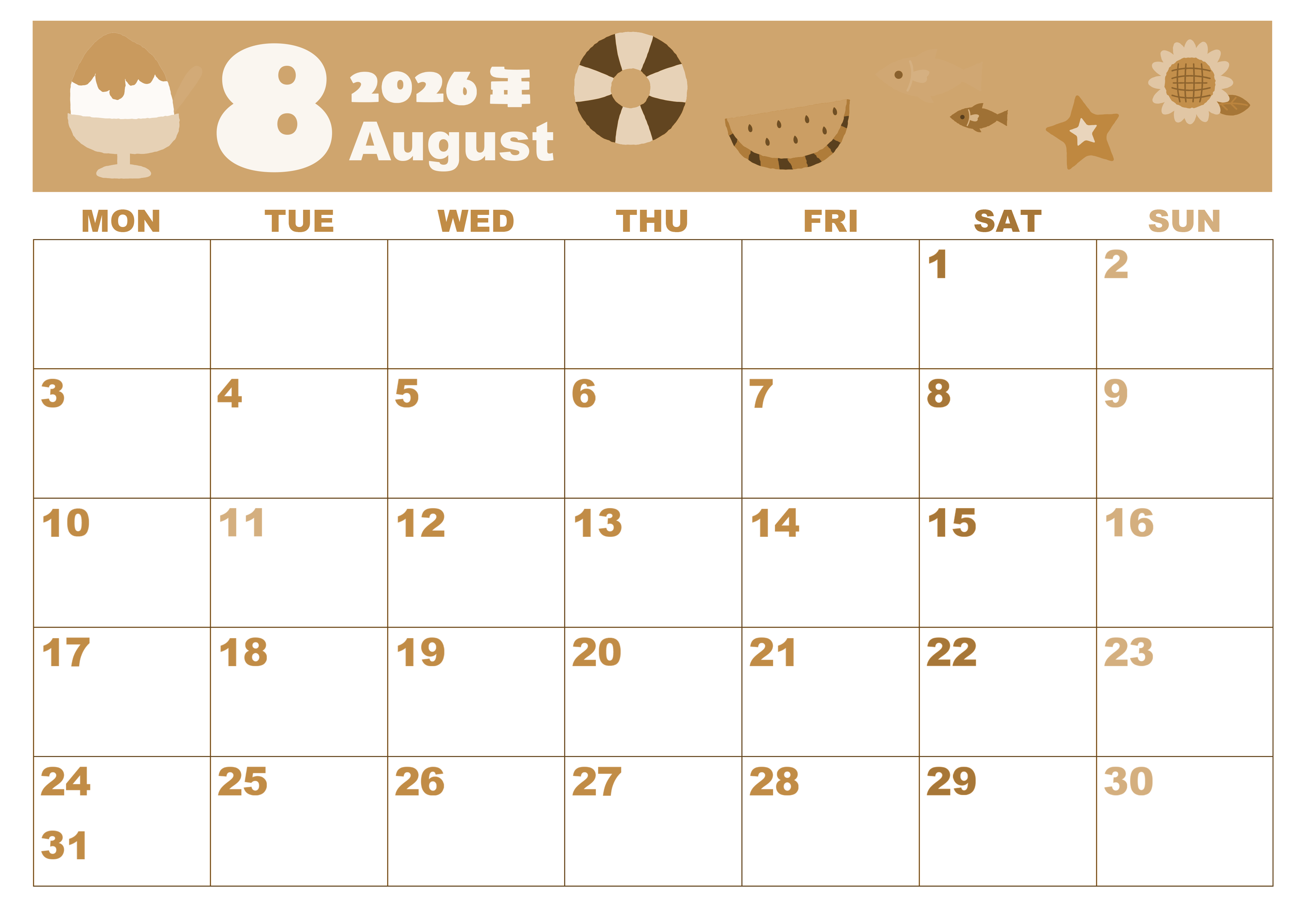 2026年8月横型レトロな月曜始まりの無料テンプレートセピア調カレンダーです。月曜始まりで利便性の高いセピア調カレンダー素材は無料で使えます。白く大きな数字の文字がまるっこくてかわいいです。イラストは夏休みがテーマです。(2026-00590801)
