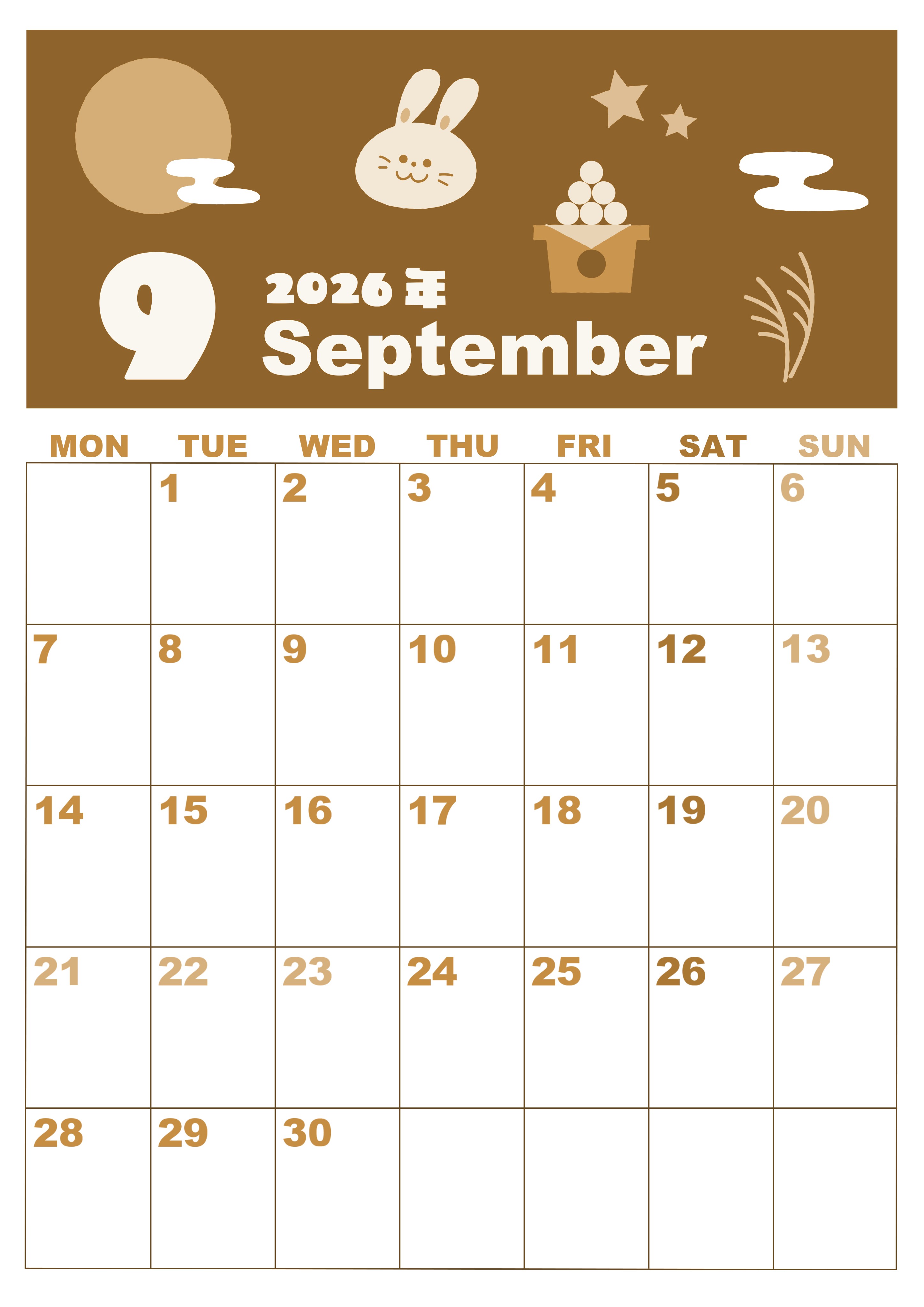 2026年9月縦型レトロな月曜始まりの無料テンプレートセピア調カレンダーです。文字の色分けがされているので予定管理にとても向いています。お月見をテーマに取り上げたイラストもかわいいので使うモチベーションが上がります。(2026-00590911)