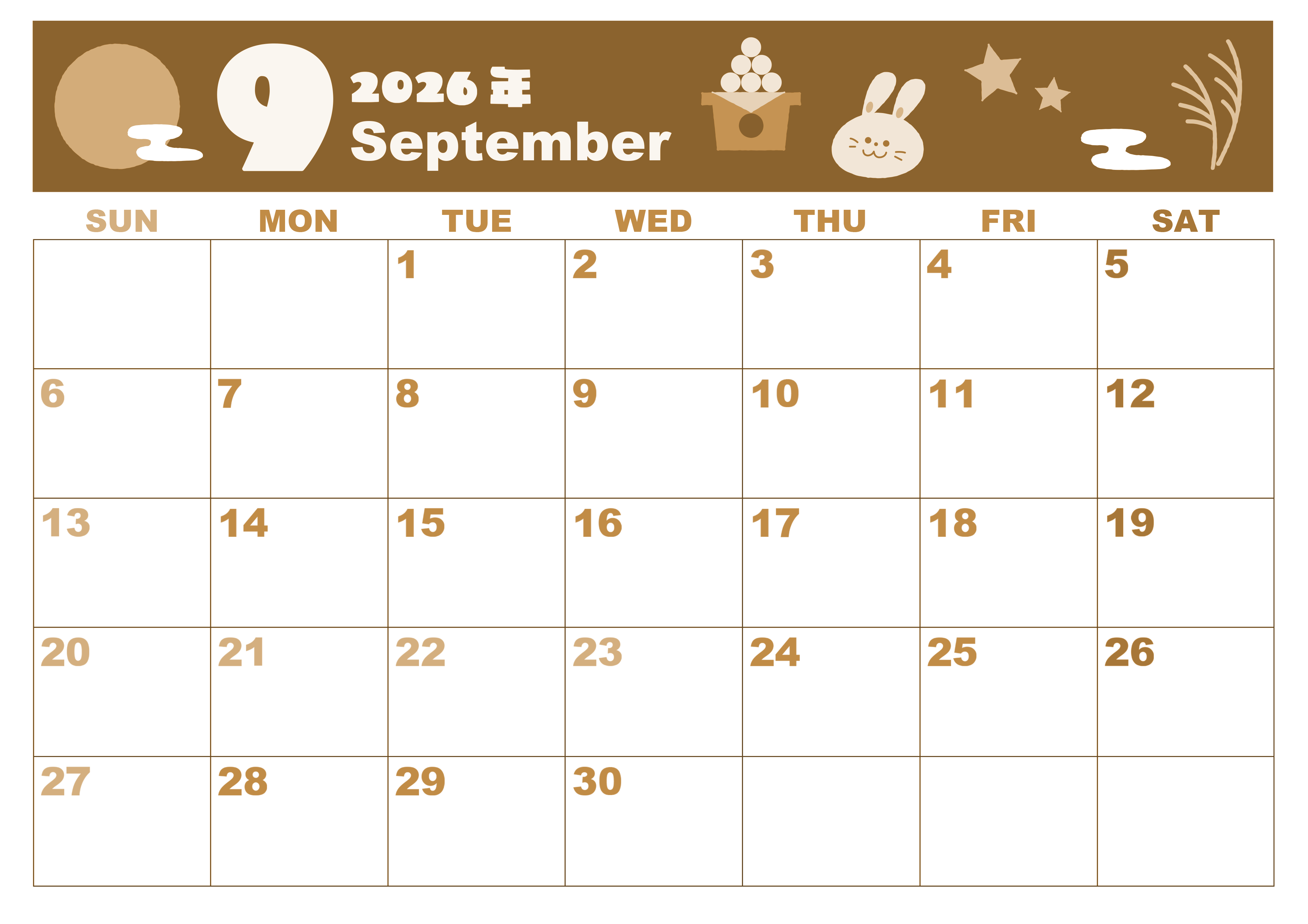 2026年9月横型レトロな日曜始まりの無料テンプレートセピア調カレンダーです。ぷにゅっとした「9月」の文字が存在感がありながらもとってもかわいいフォントです。お月見のイラストにもかわいいが詰まっています。(2026-00590900)