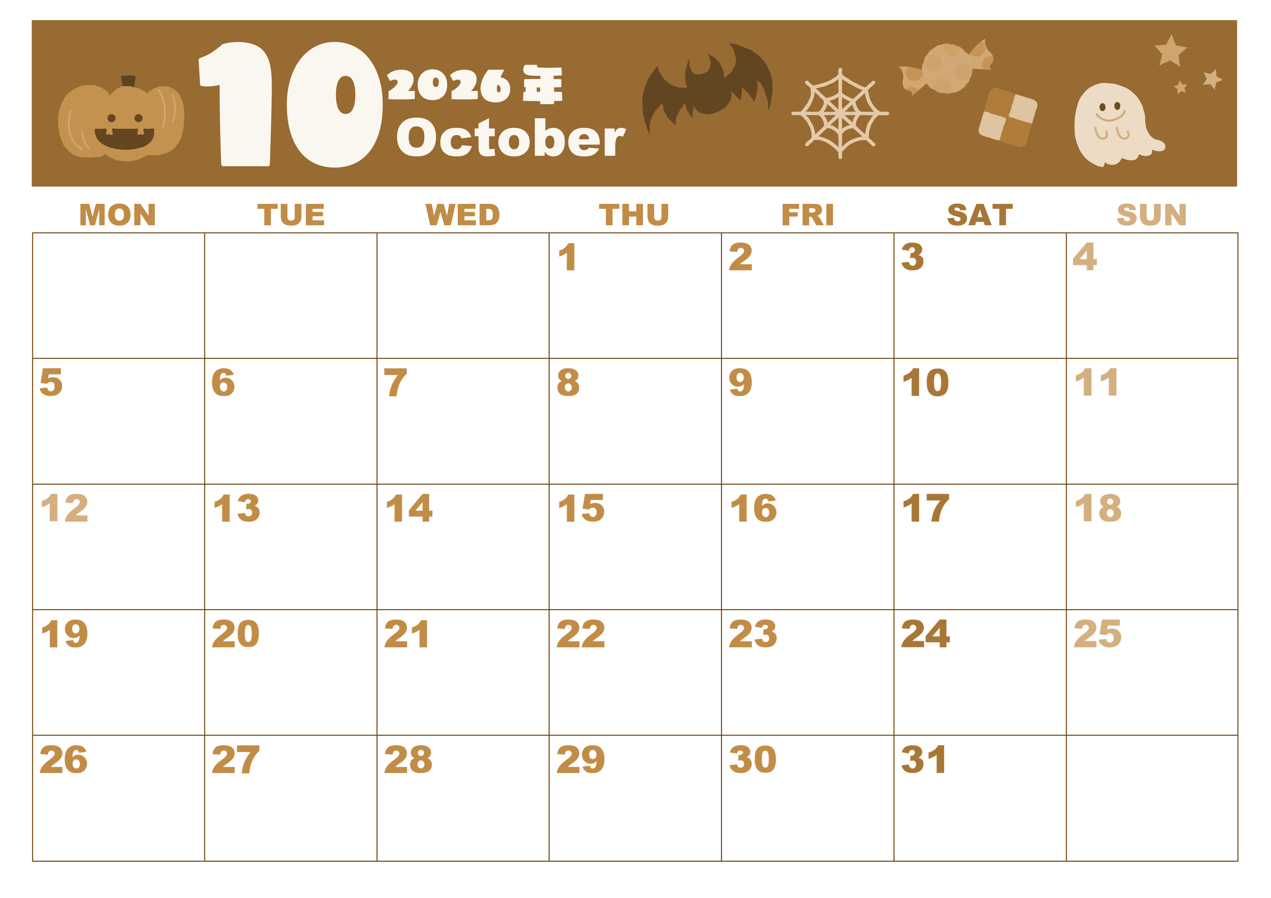 2026年10月横型レトロな月曜始まりの無料テンプレートセピア調カレンダーです。クッキーやキャンディーといったお菓子だけでなくお化けやカボチャのイラストもとてもかわいい月曜始まりセピア調カレンダーです。(2026-00591001)