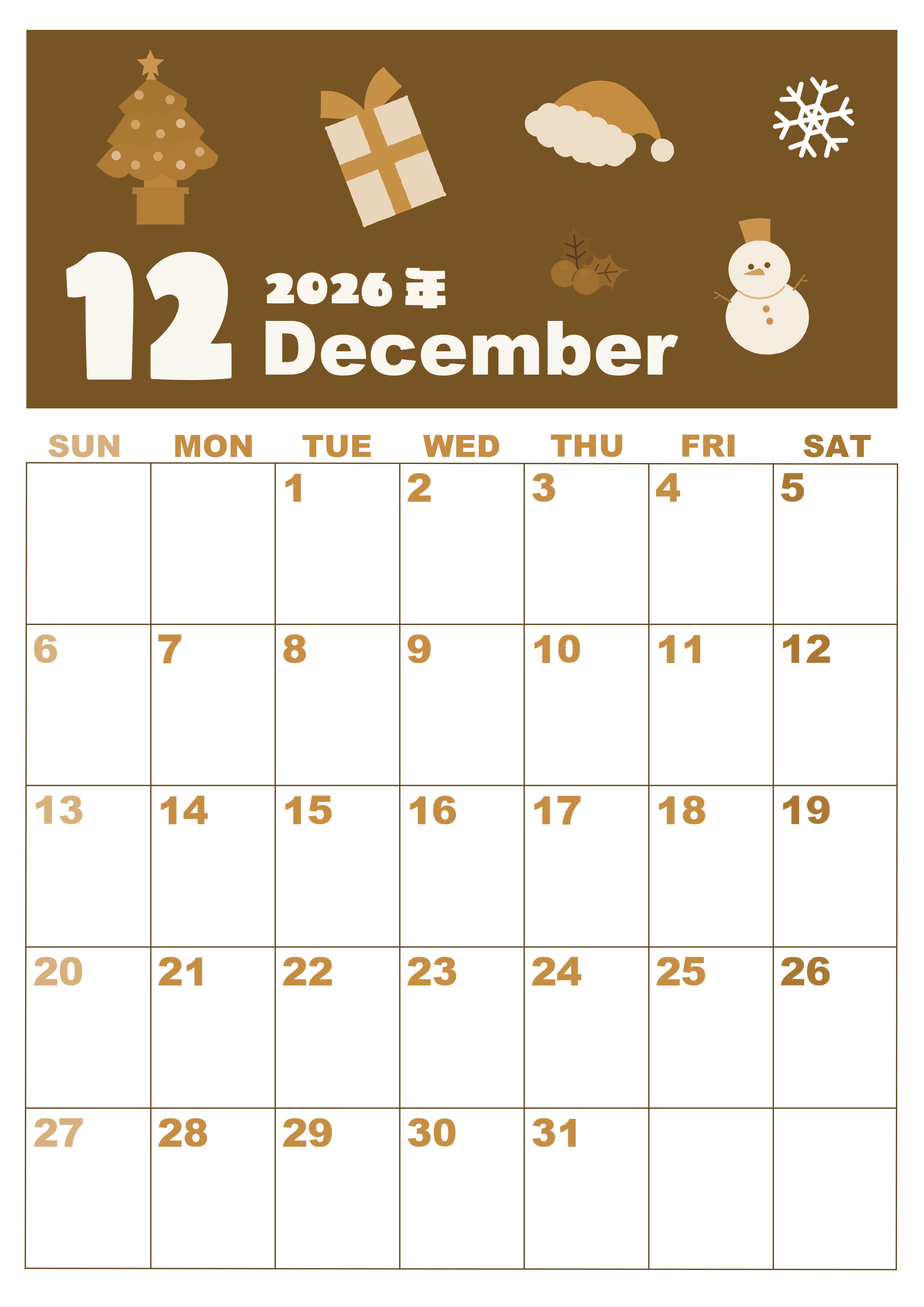 2026年12月縦型レトロな日曜始まりの無料テンプレートセピア調カレンダーです。行事のワクワクに拍車をかけてくれるようなかわいいイラストがとても特徴的なレイアウトとなっています。予定の把握にもおすすめです。(2026-00591210)