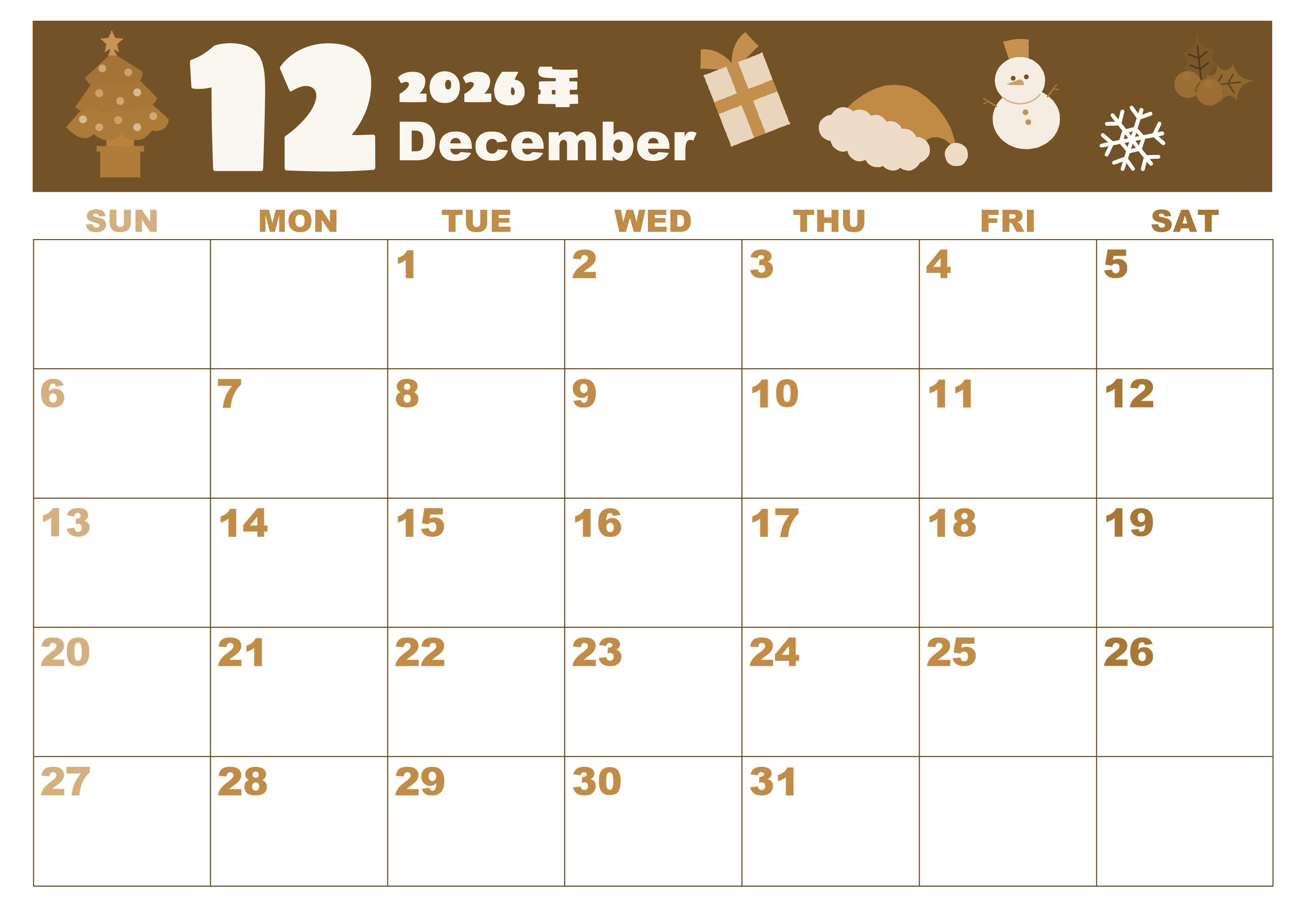2026年12月横型レトロな日曜始まりの無料テンプレートセピア調カレンダーです。行事にまつわるアイテムがあちこちにちりばめられているかわいいイラストに仕上げました。フォントもかわいいところがおすすめです。(2026-00591200)