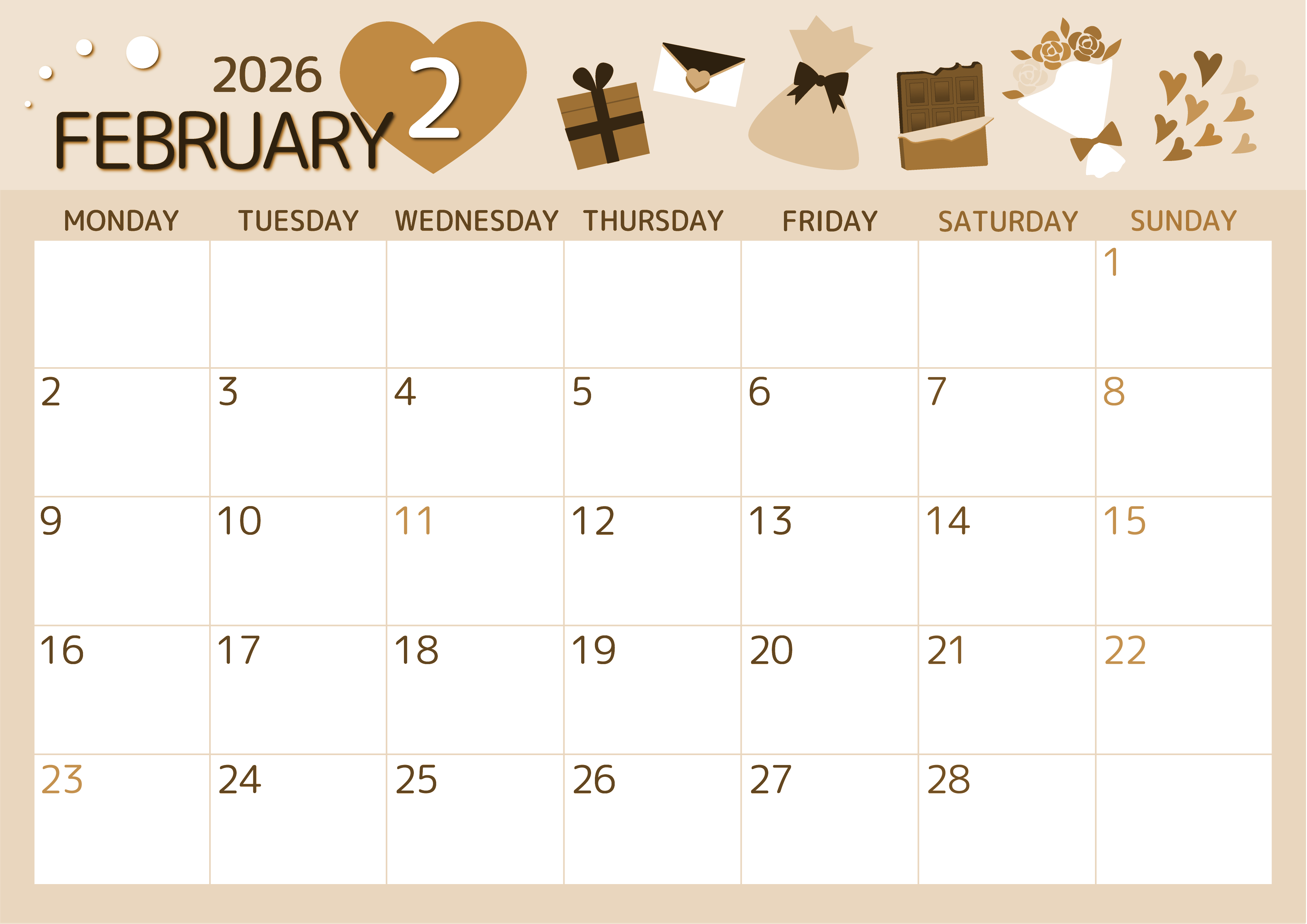 2026年2月横型レトロな月曜始まりの無料テンプレートセピア調カレンダーです。チョコや花束といったもらって嬉しいプレゼントのイラストがかわいい月曜始まりの罫線が見やすいタスク管理に適した無料セピア調カレンダーです。(2026-00600201)