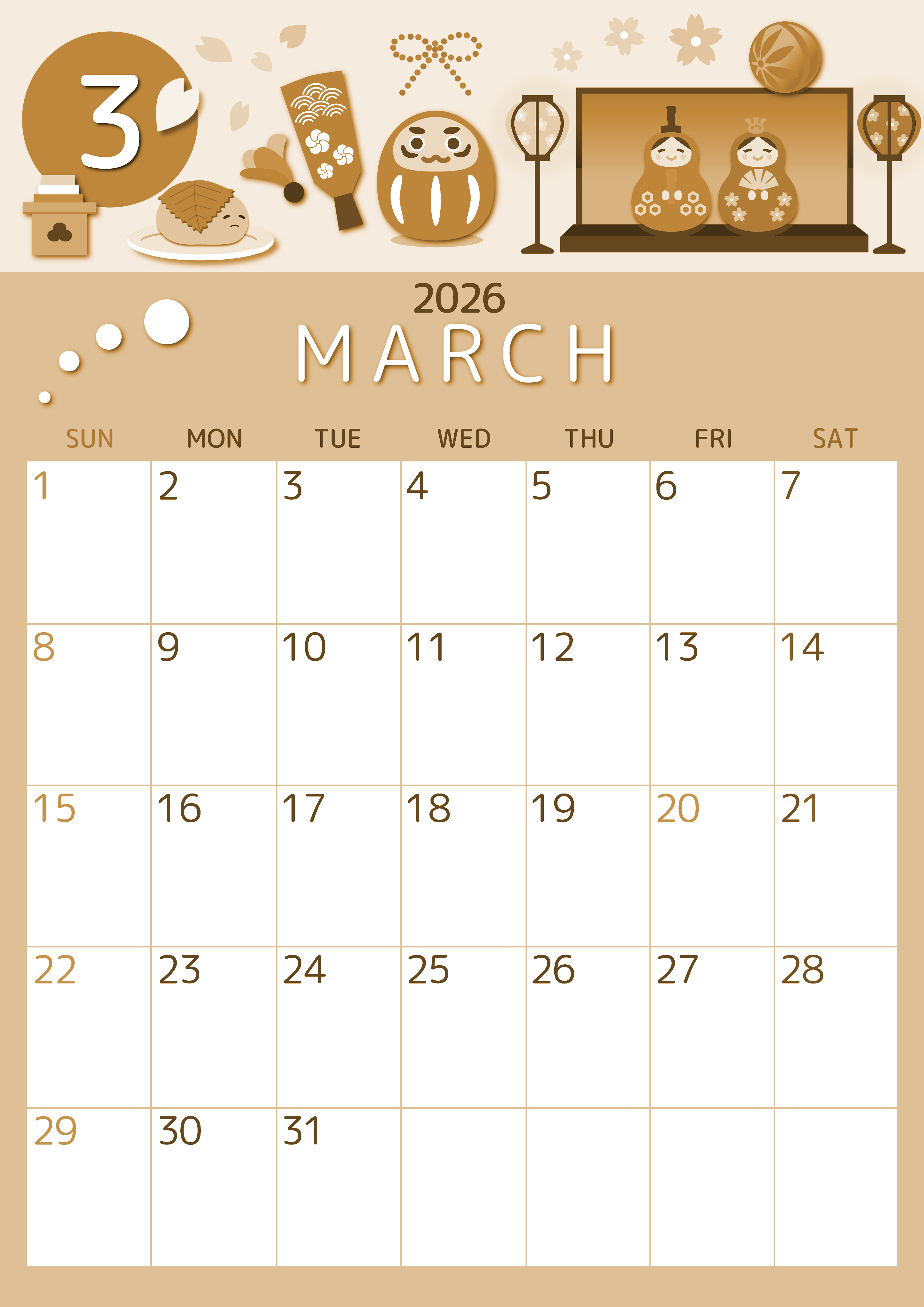 2026年3月縦型レトロな日曜始まりの無料テンプレートセピア調カレンダーです。スケジュール記入欄には色分けされている曜日が分かりやすい日付が印字されている使いやすいセピア調カレンダーです。イラストもシンプルかつかわいいものとなっています。(2026-00600310)