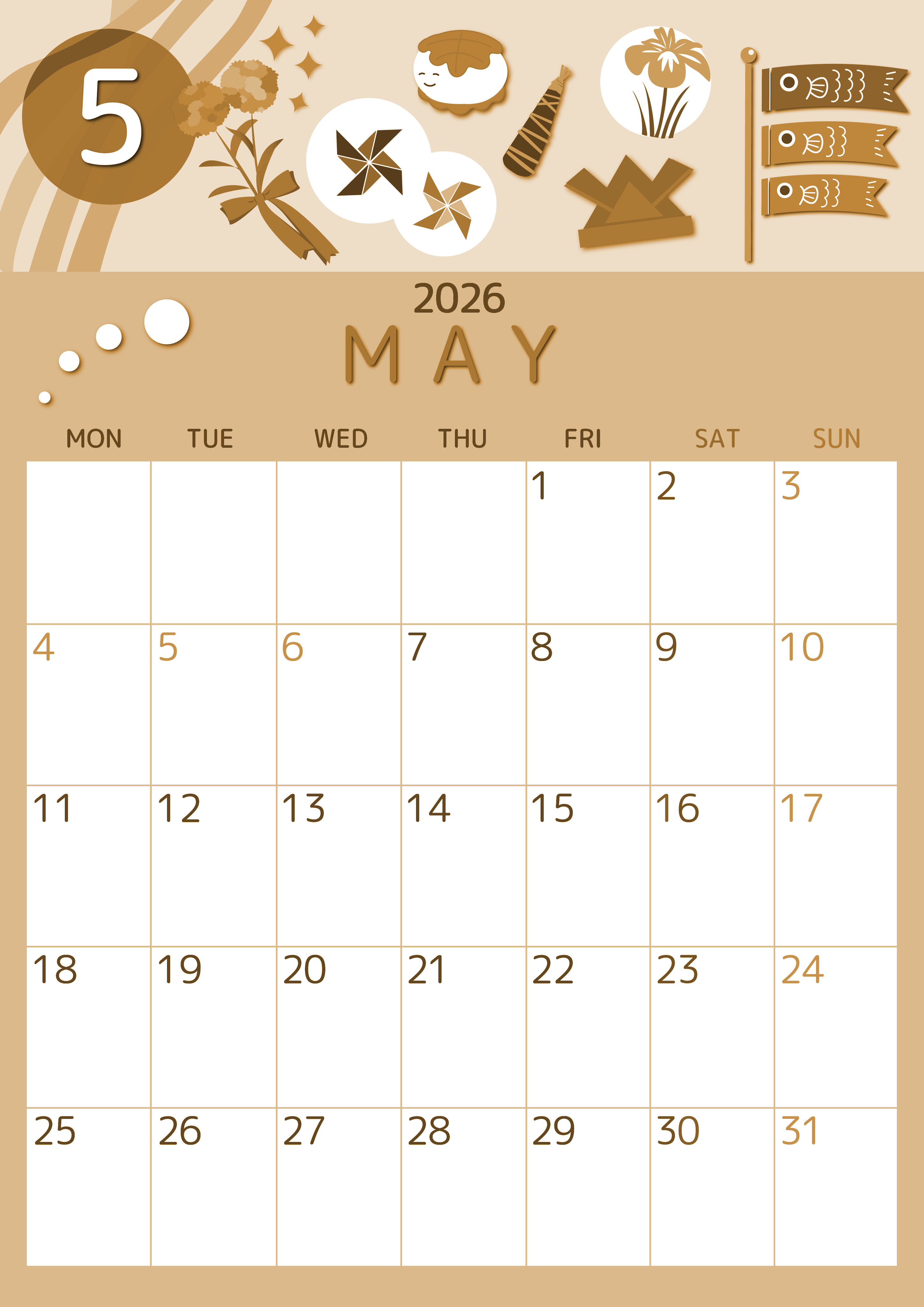 2026年5月縦型レトロな月曜始まりの無料テンプレートセピア調カレンダーです。イベントを書き込んでタスク管理をしやすい月曜始まりの無料セピア調カレンダーをダウンロードしてかわいいイラストも楽しみながら活用して下さい。(2026-00600511)