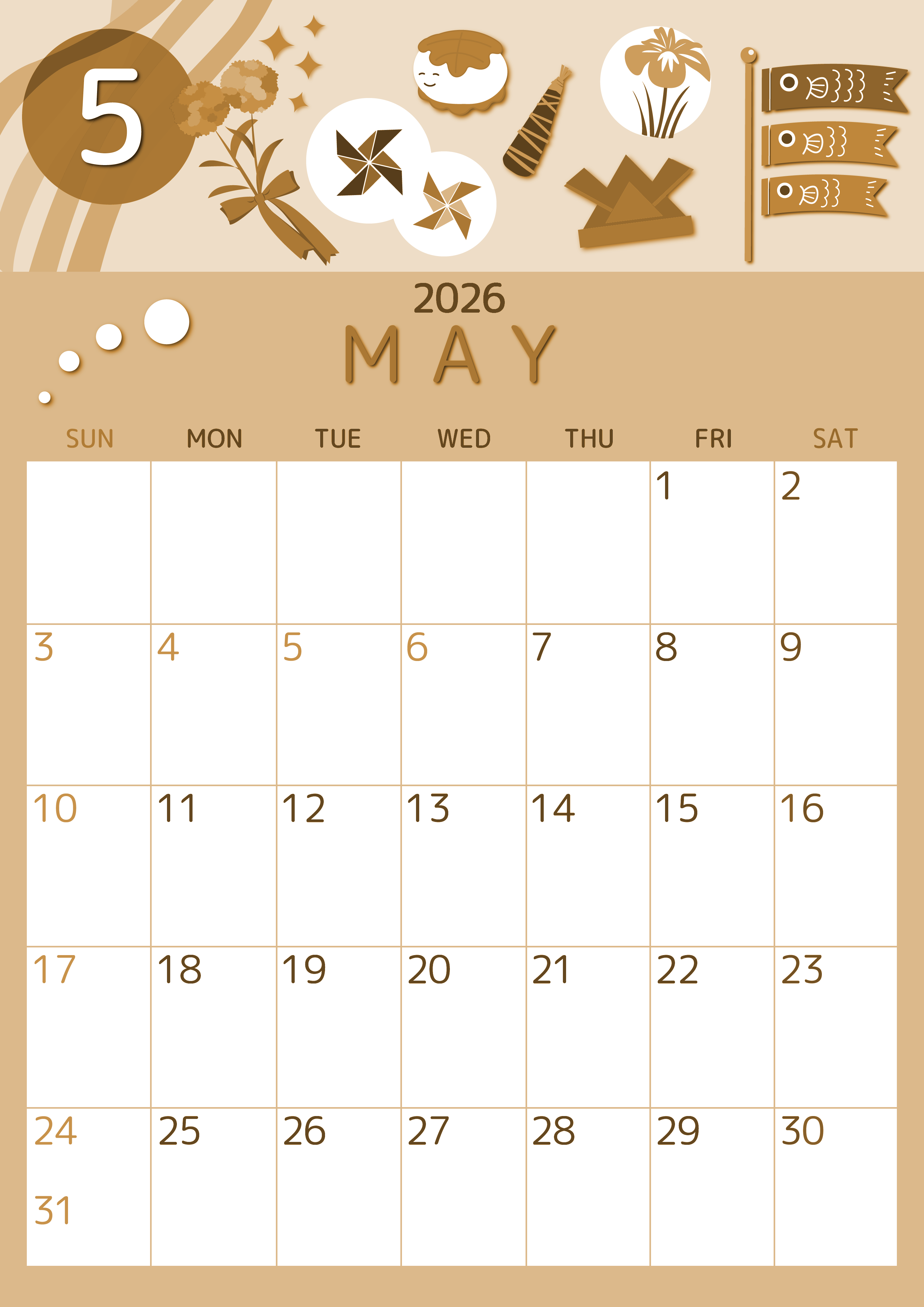 2026年5月縦型レトロな日曜始まりの無料テンプレートセピア調カレンダーです。5月はイベントで大忙しになりがちです。そのような繁忙期に行事の管理をしやすいセピア調カレンダーをおすすめします。かわいいデザインのイラストも魅力的です。(2026-00600510)