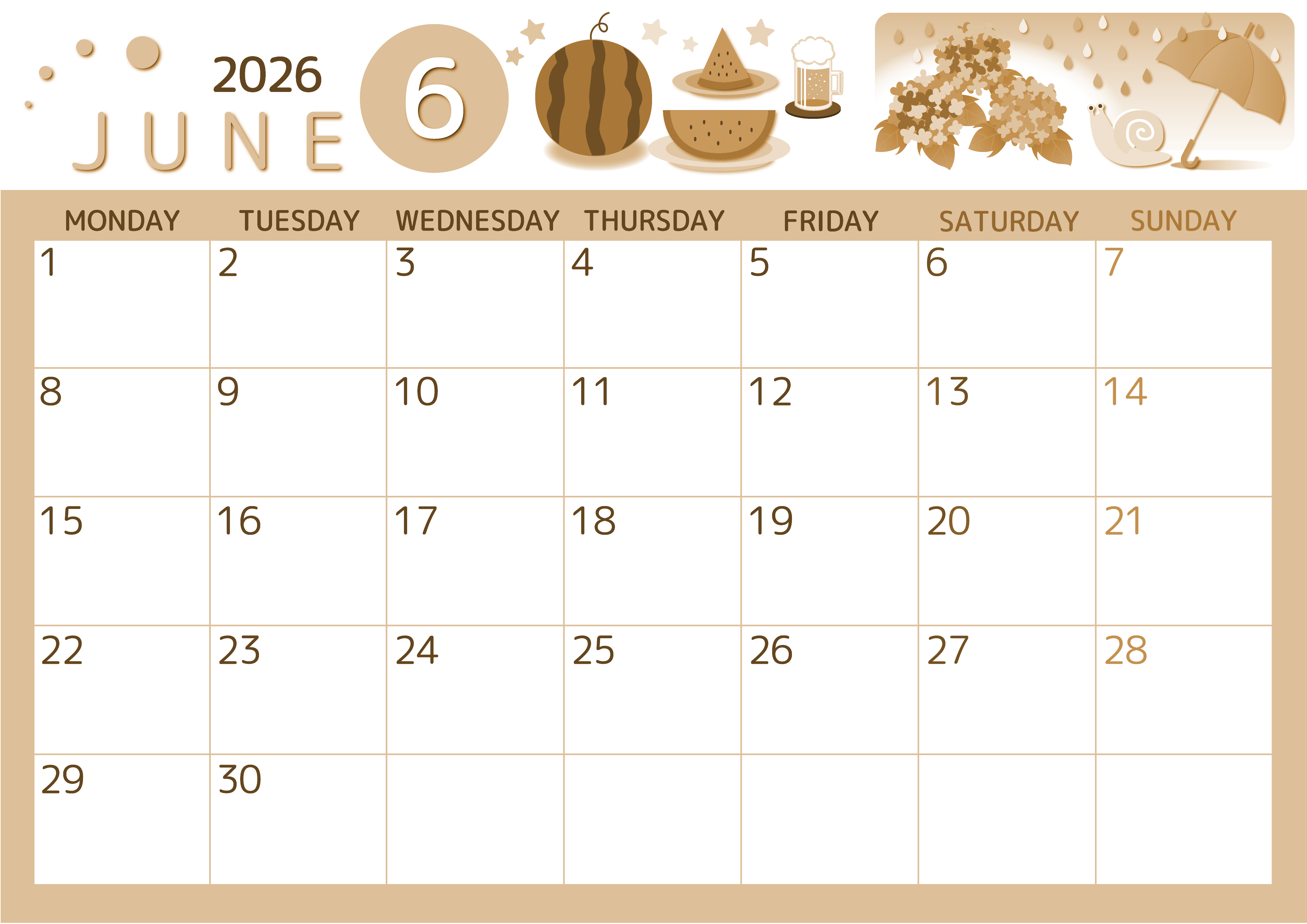 2026年6月横型レトロな月曜始まりの無料テンプレートセピア調カレンダーです。月曜始まりでA4サイズのセピア調カレンダーです。すいかと梅雨をモチーフにしたイラストがかわいいのでスケジュールを立てるのが楽しくなります。(2026-00600601)