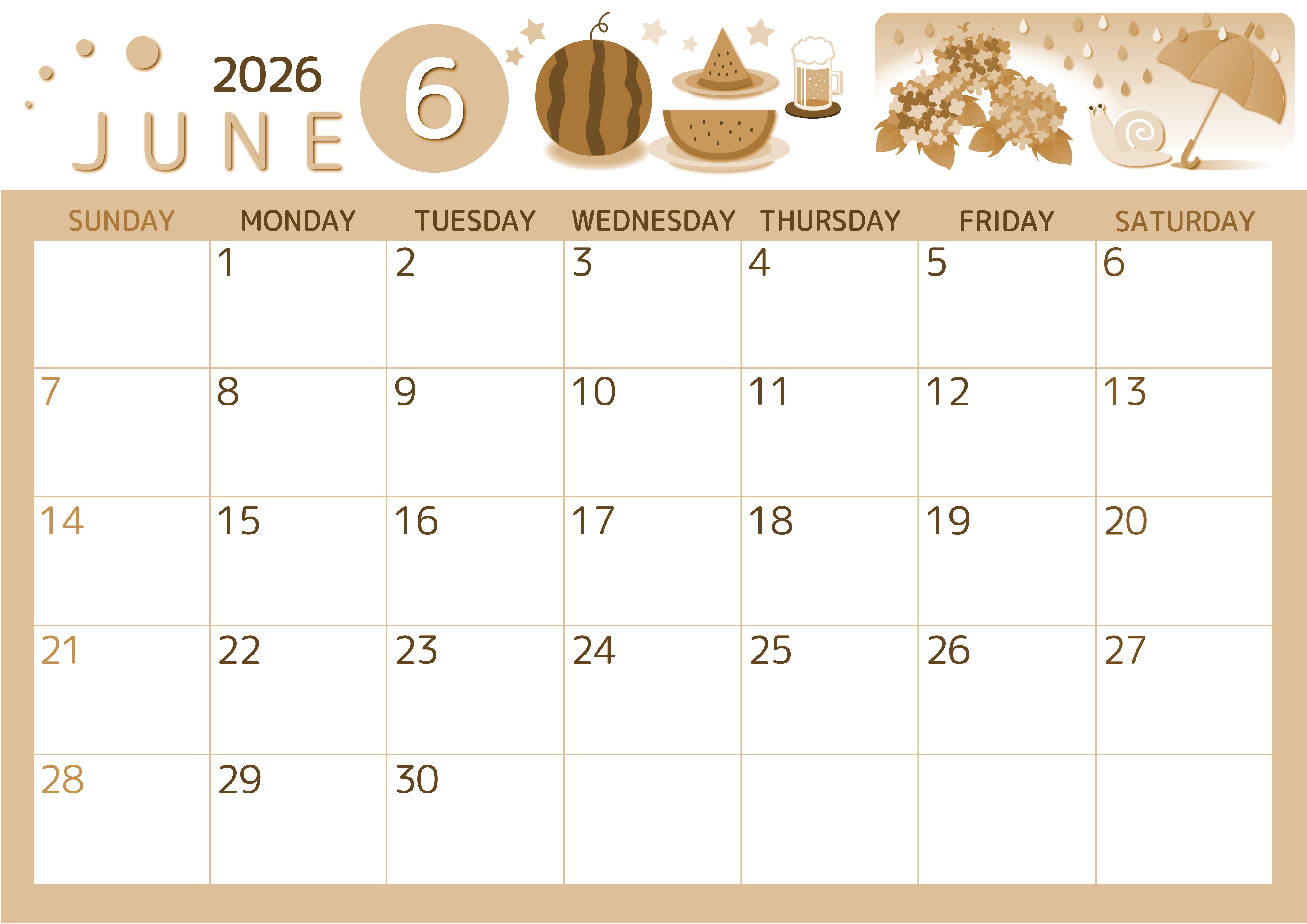 2026年6月横型レトロな日曜始まりの無料テンプレートセピア調カレンダーです。すいかとビールがおいしそうで飲食したくなるようなかわいいイラストのセピア調カレンダーです。いろいろなアイテムがちりばめられているのでキュートです。(2026-00600600)