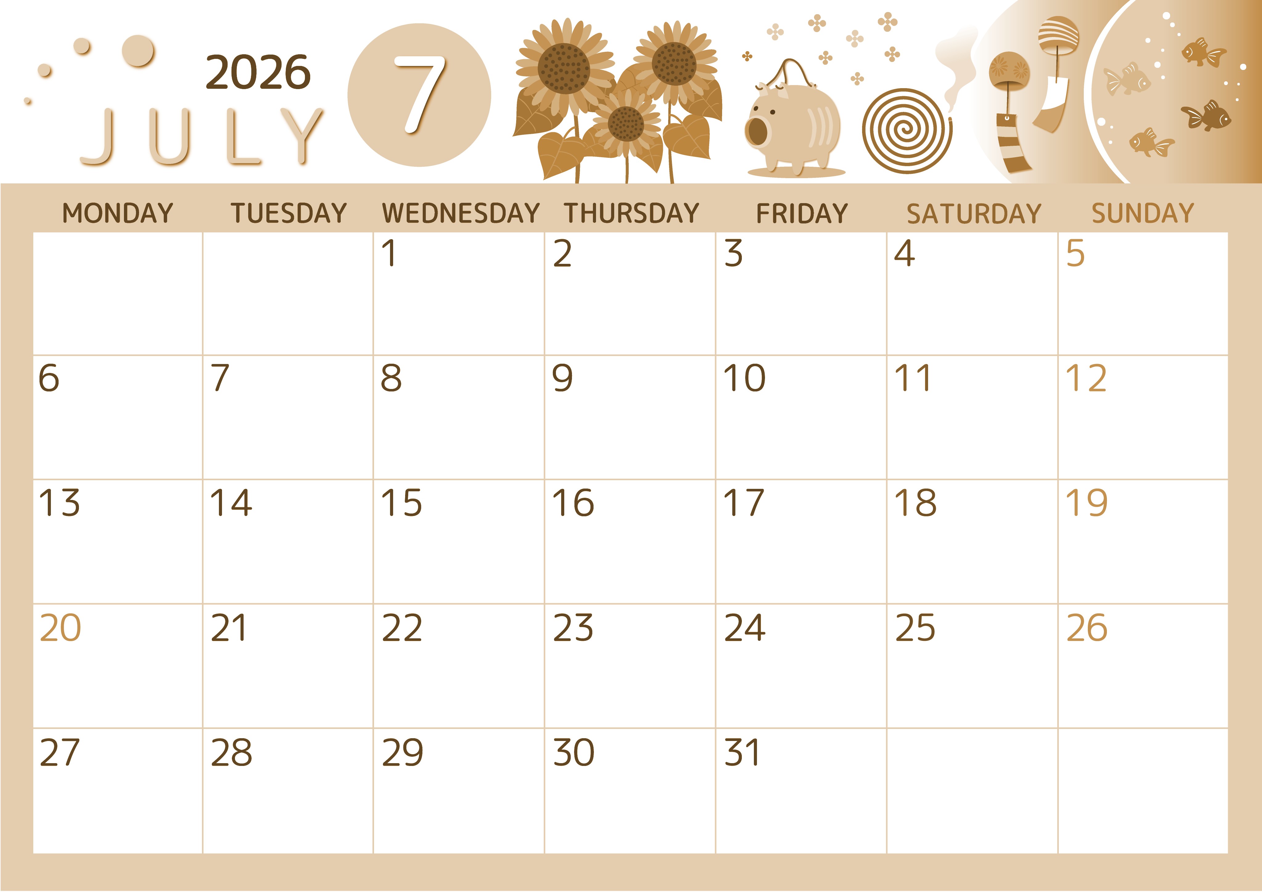 2026年7月横型レトロな月曜始まりの無料テンプレートセピア調カレンダーです。蚊取り線香の香りが漂ってきそうな夏休みの儚さや楽しさを思い出させてくれるようなちょっと切ないかわいいイラスト付きの月曜始まりセピア調カレンダーです。(2026-00600701)