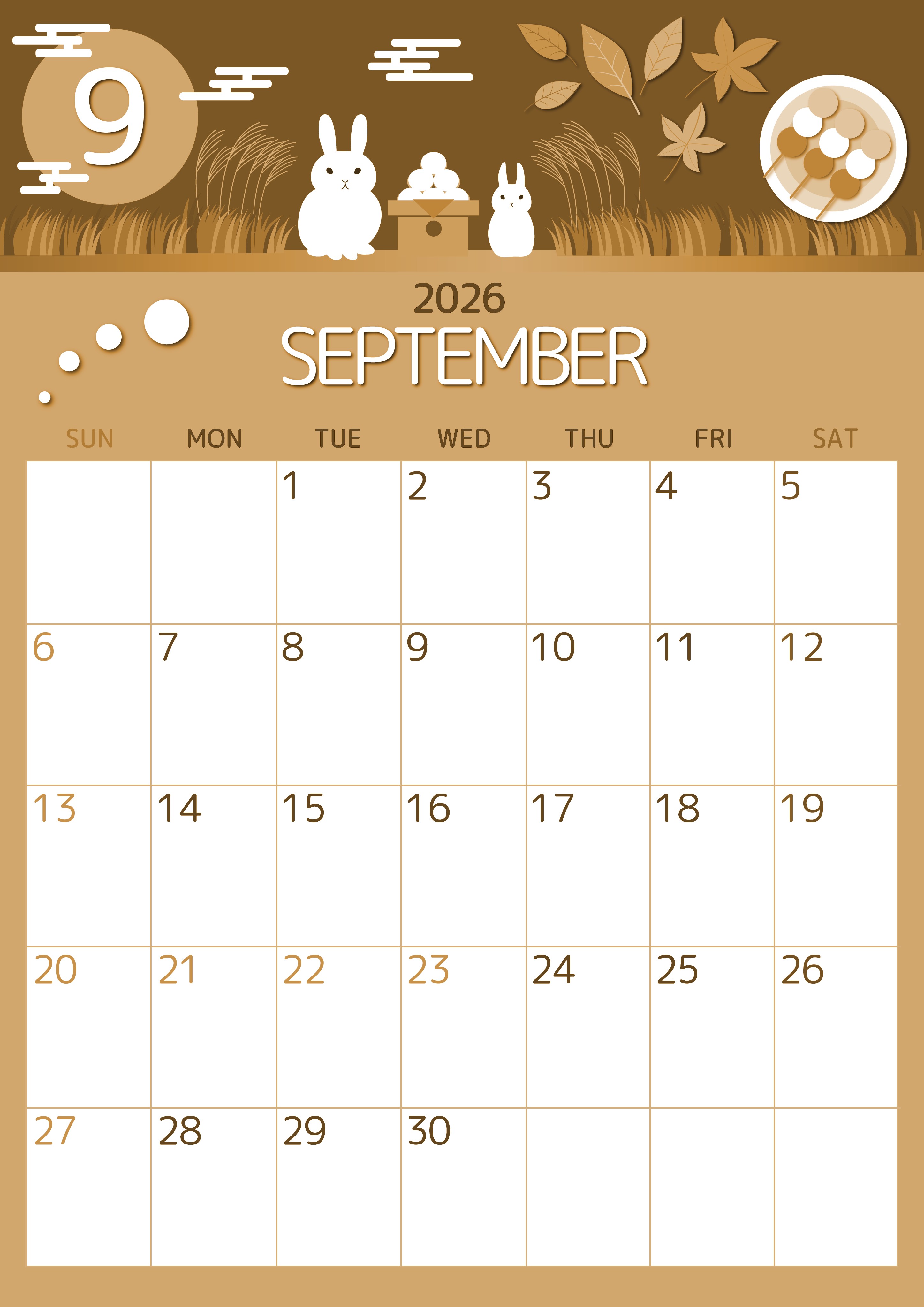 2026年9月縦型レトロな日曜始まりの無料テンプレートセピア調カレンダーです。文字が細いフォントなのでスッキリとして見やすいデザインです。イラスト部分は十五夜を題材にしていてかわいいポップな調子です。(2026-00600910)