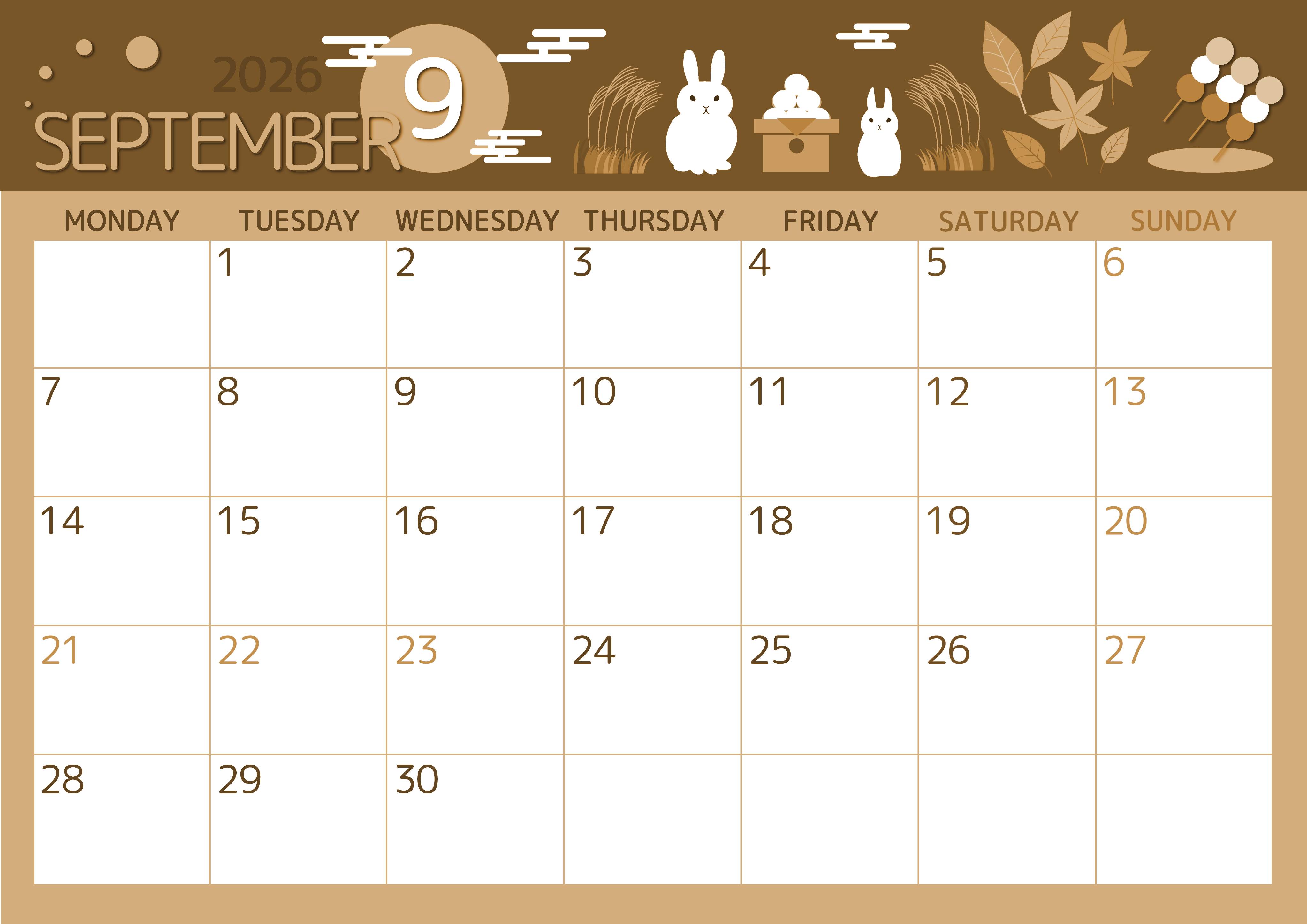 2026年9月横型レトロな月曜始まりの無料テンプレートセピア調カレンダーです。十五夜をテーマにしたイラストがふんだんに描かれています。うさぎさんがかわいいです。三色団子や紅葉やススキや満月も目を引くポイントです。(2026-00600901)