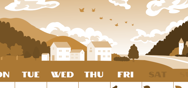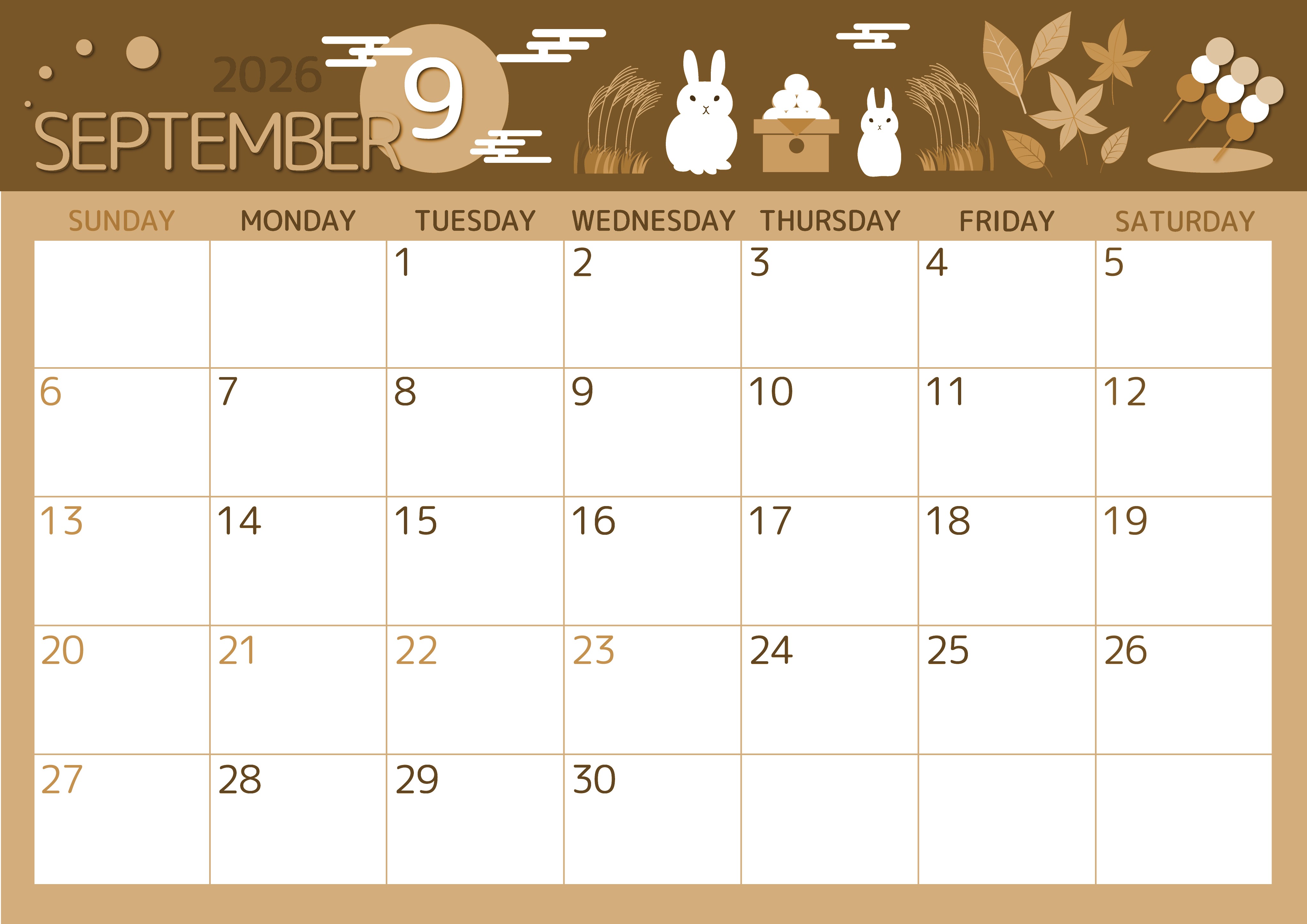 2026年9月横型レトロな日曜始まりの無料テンプレートセピア調カレンダーです。十五夜の様子を非常に賑やかに細かく書き上げたかわいいイラストにセピア調カレンダー部分をフレーミングしたとてもかわいいデザインです。(2026-00600900)
