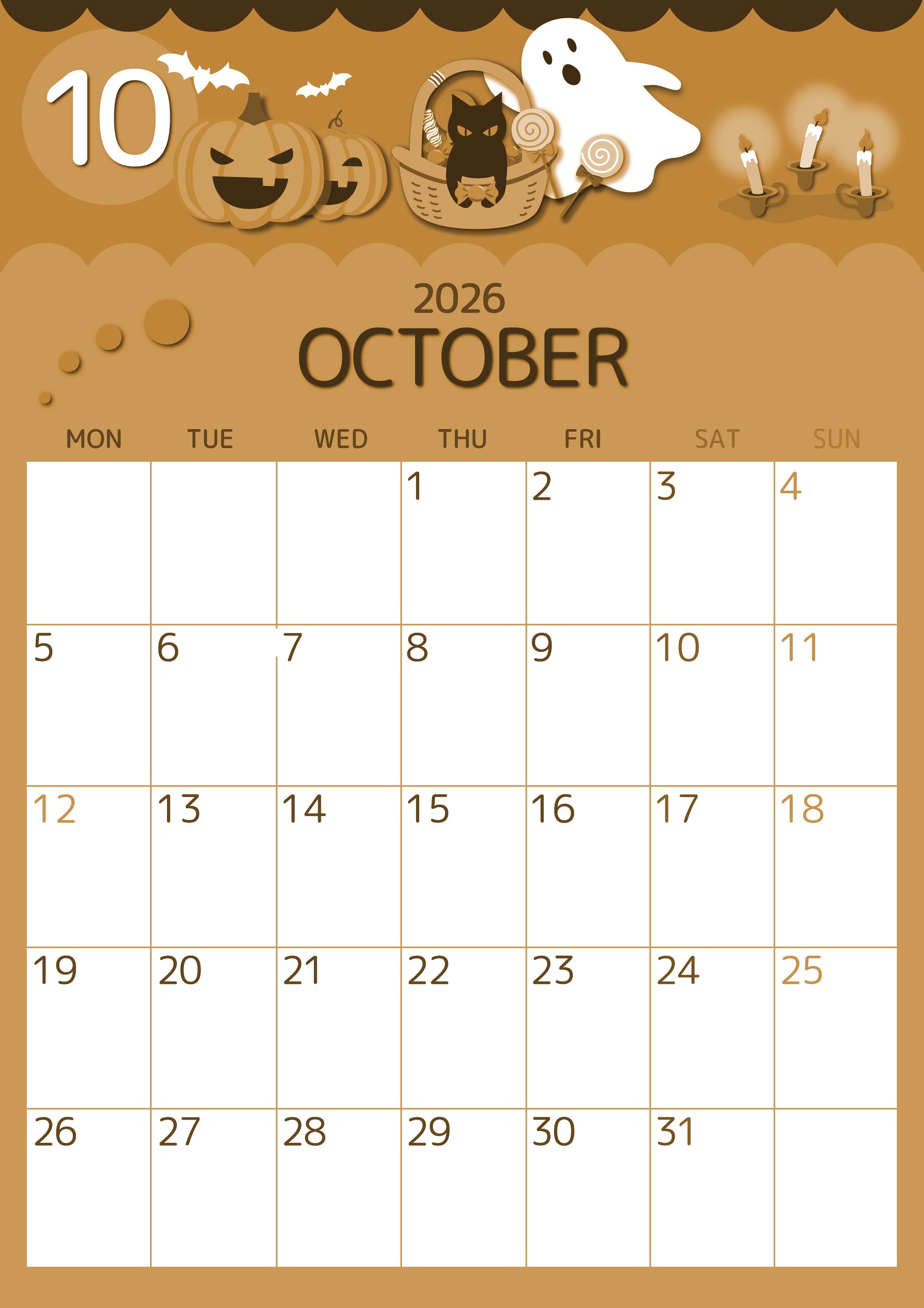 2026年・無料のカレンダーテンプレート 2026年10月縦型レトロな月曜始まり 行事イラストのかわいいA4無料セピア調カレンダー(2026-00601011) 素材状デザイン王 2025年4月2日 2026年10月縦型レトロな月曜始まりの無料テンプレートセピア調カレンダーです。罫線がはっきり惹かれていて曜日ごとに文字の色分けをしているので見やすいです。行事に関するイラスト部分もかわいいです。(2026-00601011) 10月 縦型のカレンダー 月曜始まり セピア カレンダーデザイン-0060