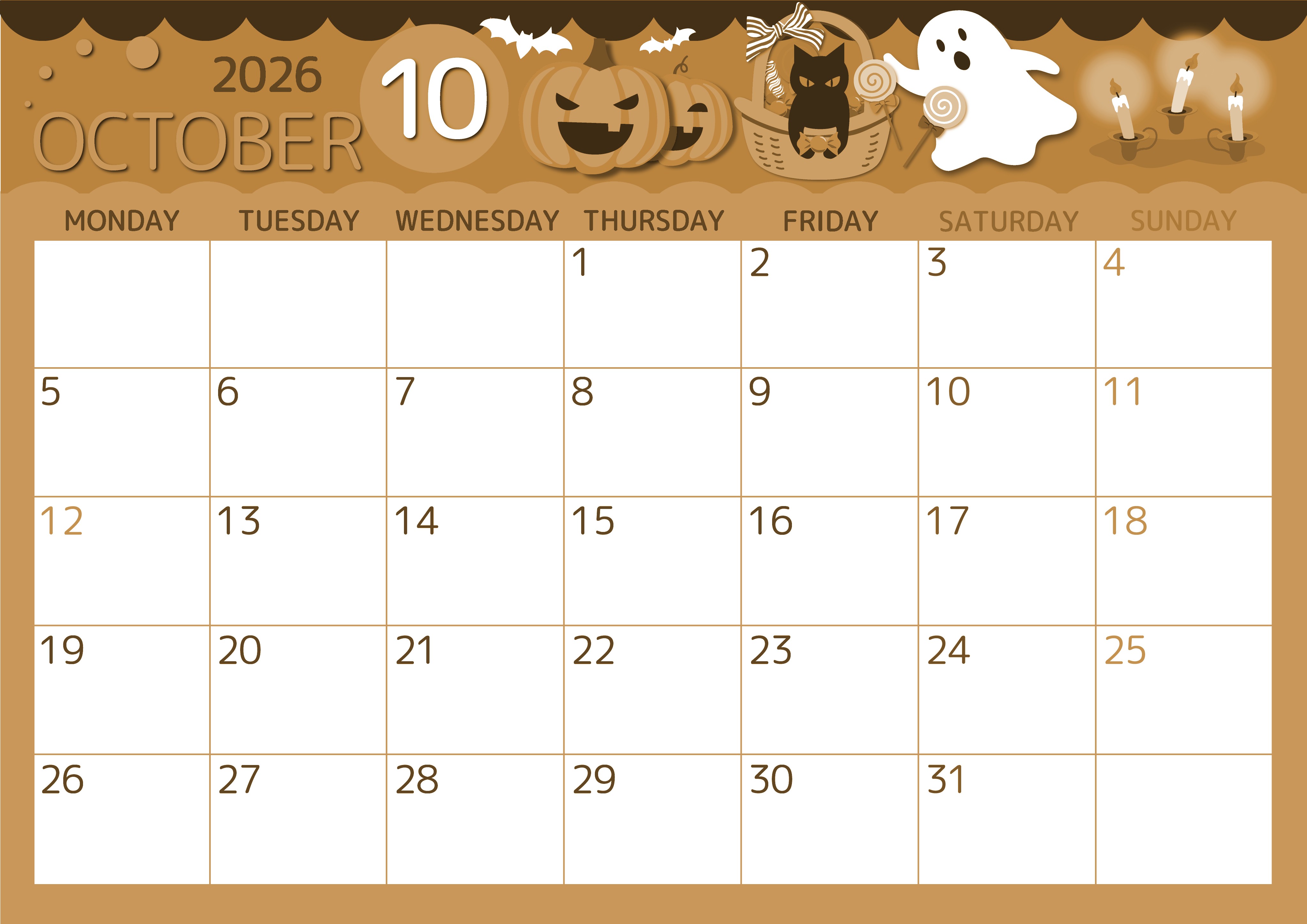 2026年10月横型レトロな月曜始まりの無料テンプレートセピア調カレンダーです。文字の線が細いのですっきりとして計画を俯瞰して見やすいフリー素材です。行事を題材にしたイラスト部分もとてもかわいいです。(2026-00601001)