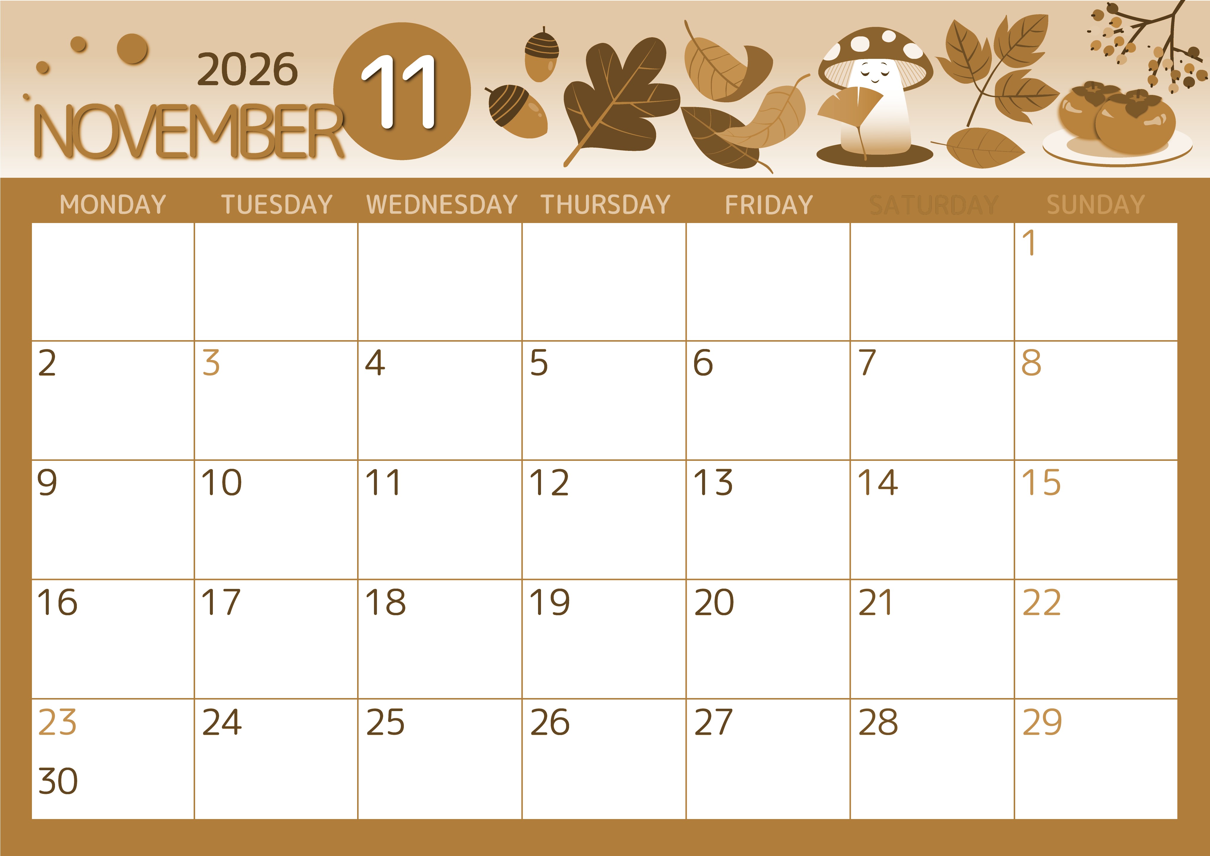 2026年11月横型レトロな月曜始まりの無料テンプレートセピア調カレンダーです。きのこが癒し系のかわいいイラストです。月曜始まりでご家族やお子様の予定を立てるのに向いているレイアウトになっています。(2026-00601101)