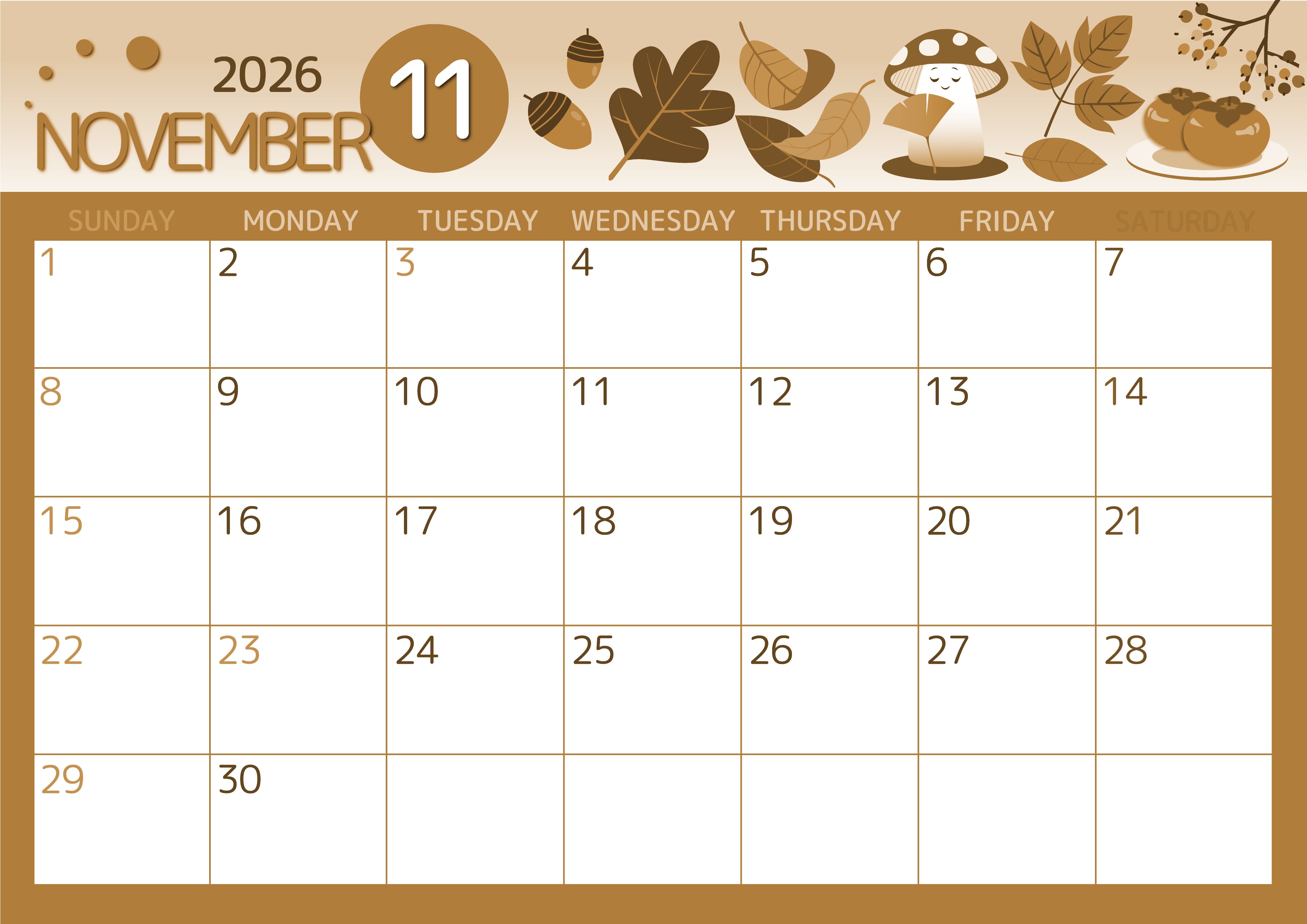 2026年11月横型レトロな日曜始まりの無料テンプレートセピア調カレンダーです。キノコが主役のイラストがかわいいです。セピア調カレンダーのフレーム部分はワインレッドでしっかり囲まれているのでシックさもあります。(2026-00601100)