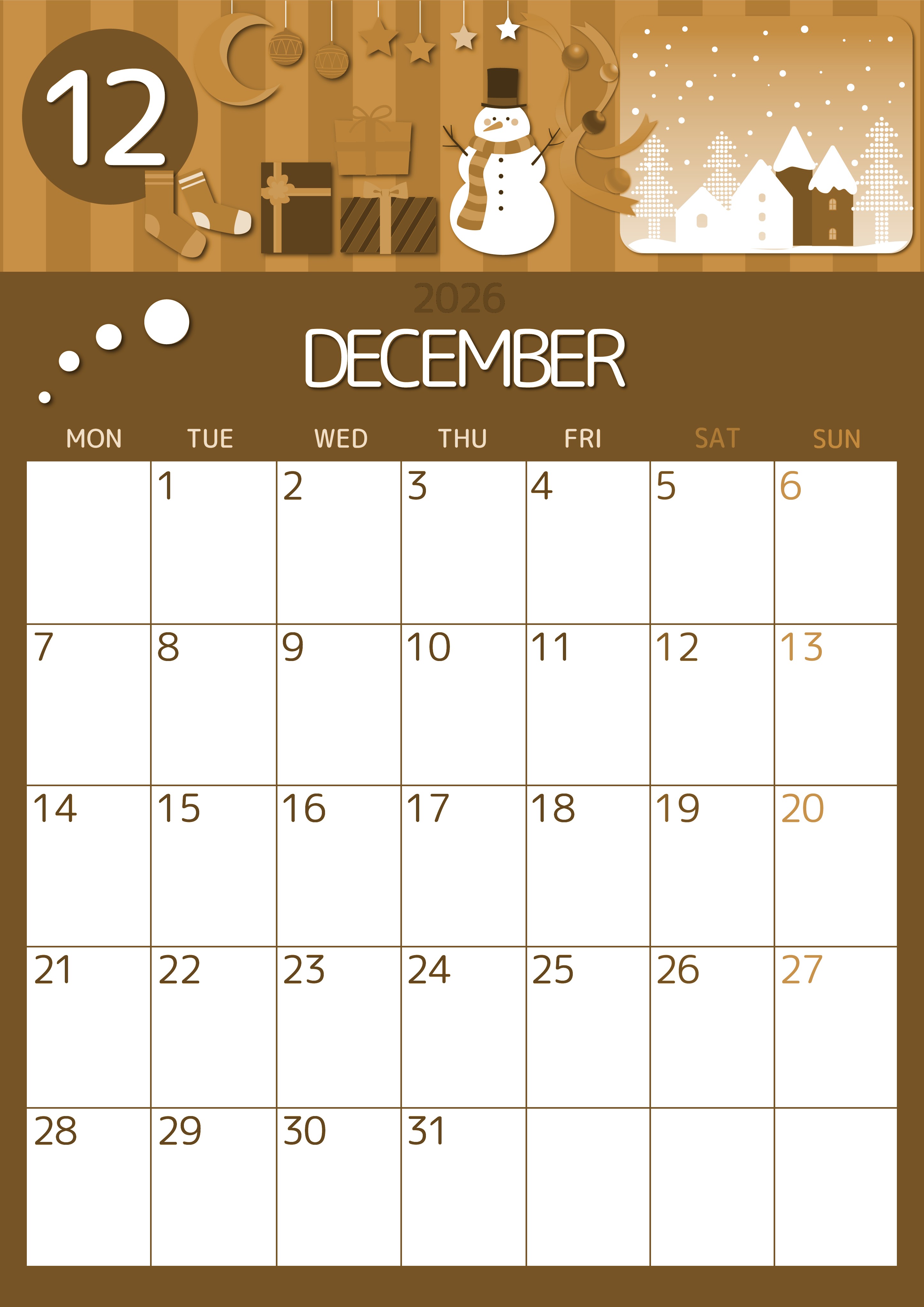 2026年12月縦型レトロな月曜始まりの無料テンプレートセピア調カレンダーです。オーナメントの下にちょこんと佇んでいる雪だるまのイラストがかわいいです。クリスマスのプランニングのモチベーションが上がります。(2026-00601211)