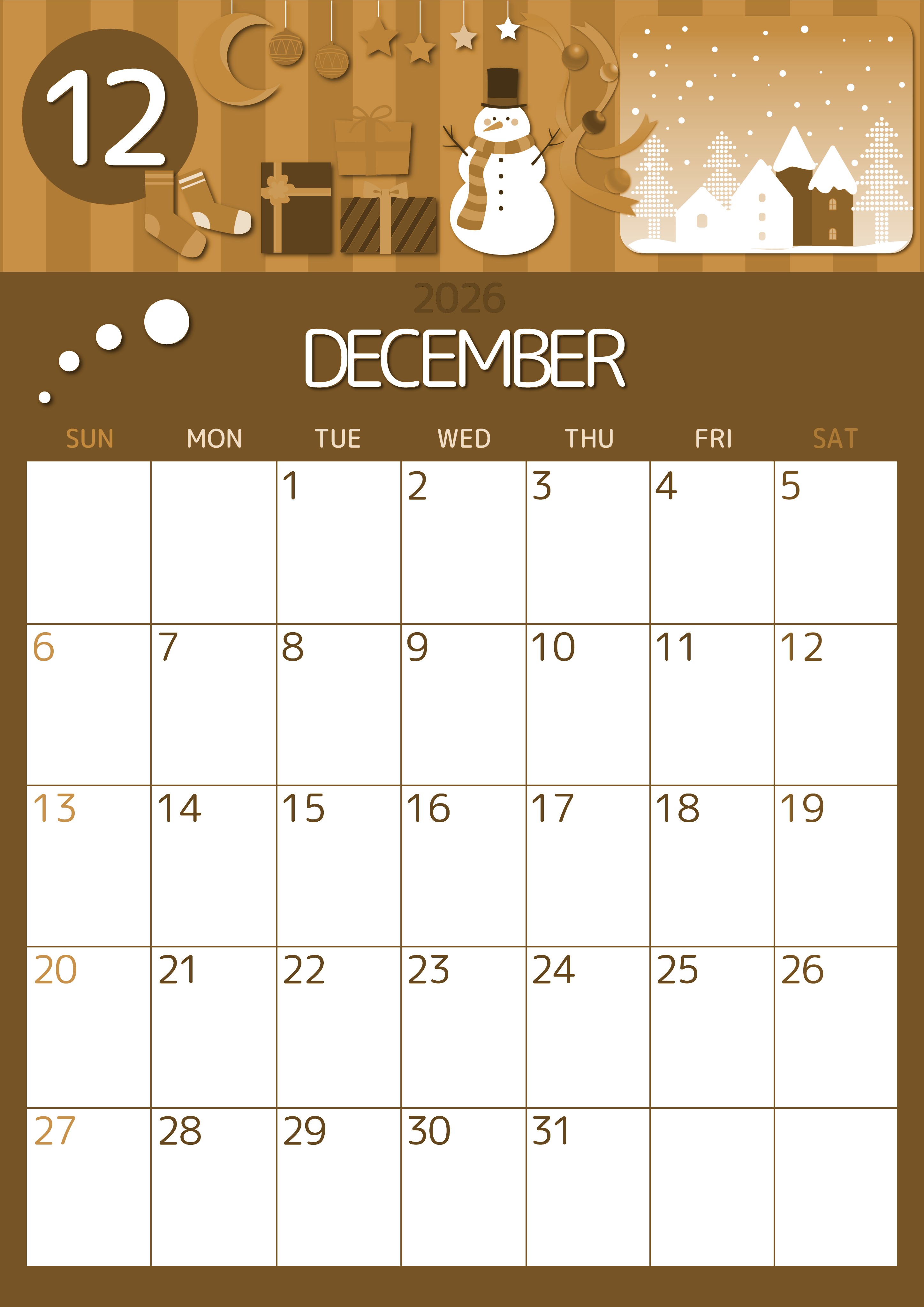 2026年12月縦型レトロな日曜始まりの無料テンプレートセピア調カレンダーです。セピア調カレンダーの枠は緑色でセピア調カレンダー部分は背景が白色なので予定を記入しやすいです。イラスト部分は雪だるまがアクセントになっていてかわいいです。(2026-00601210)