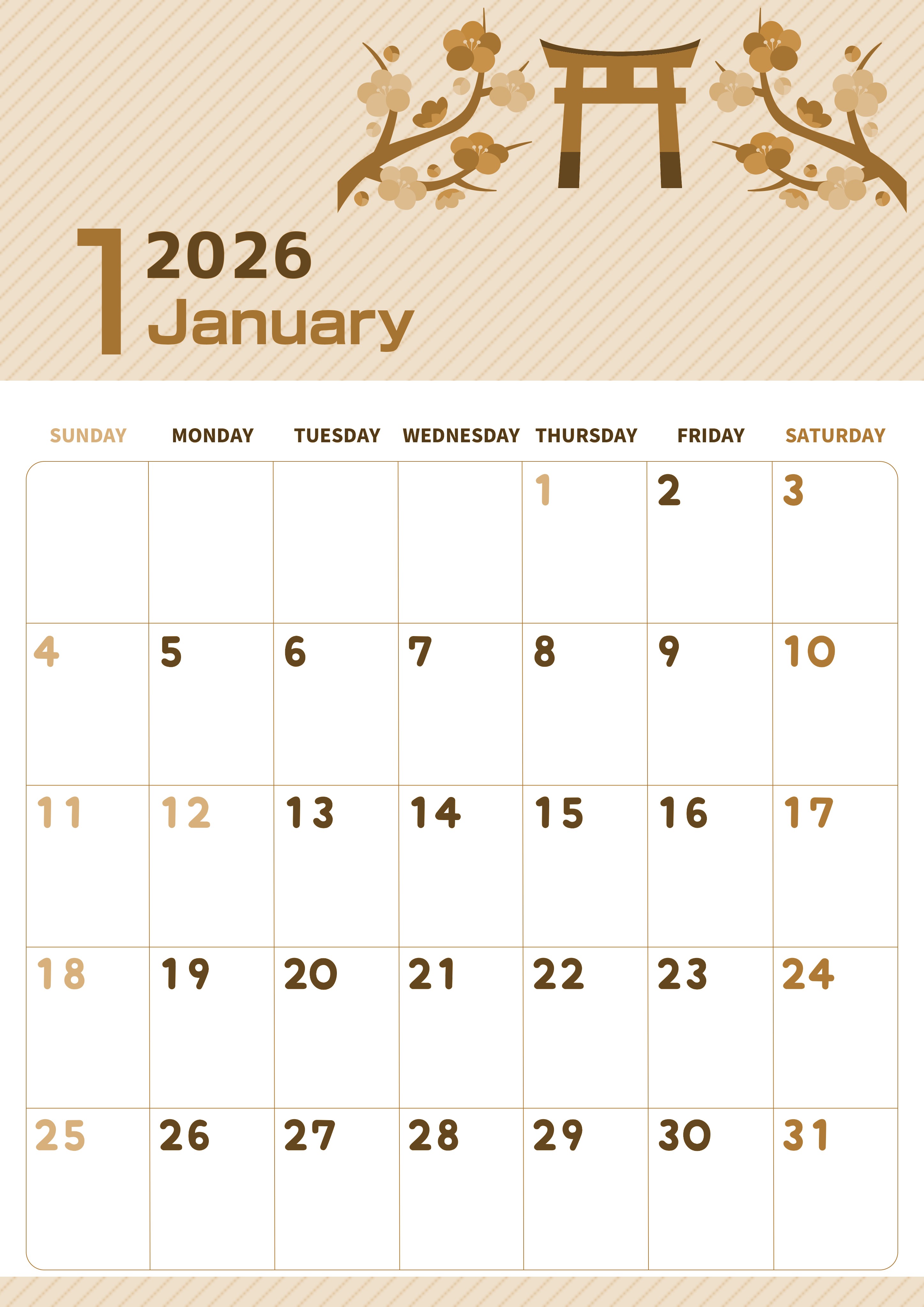 2026年1月縦型レトロな日曜始まりセピア調カレンダーです。中心に鳥居をどっしりと構えていてその両側ににょきにょきと梅の花が生き生きと生えて生命の力強さを感じさせるかわいいイラストで気持ちも明るくなれるようなセピア調カレンダーです。背景はうっすらストライプです。(2026-00610110)