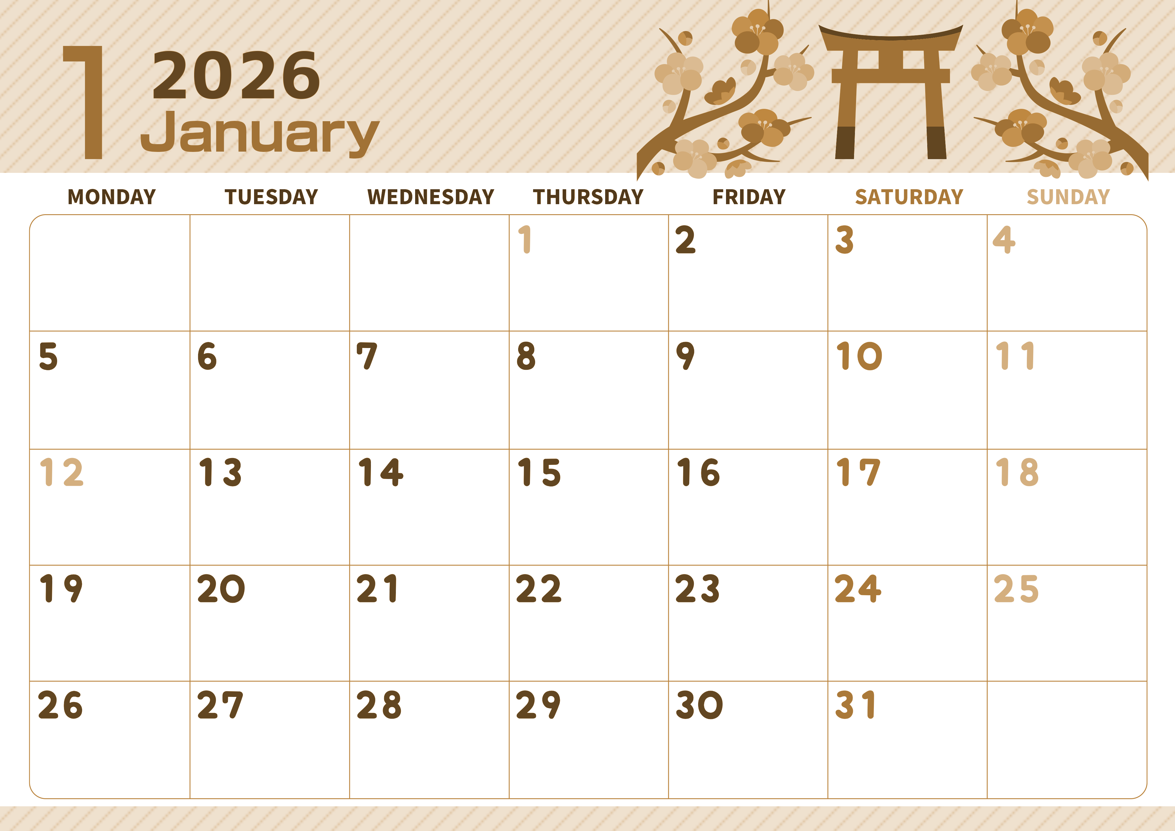 2026年1月横型レトロな月曜始まりセピア調カレンダーです。新年の幕開けを連想させる鳥居と梅の花が華々しいイラスト付きのセピア調カレンダーです。背景はストライプが施されているのでかわいいです。ダウンロードは無料で行えるフリー素材です。(2026-00610101)