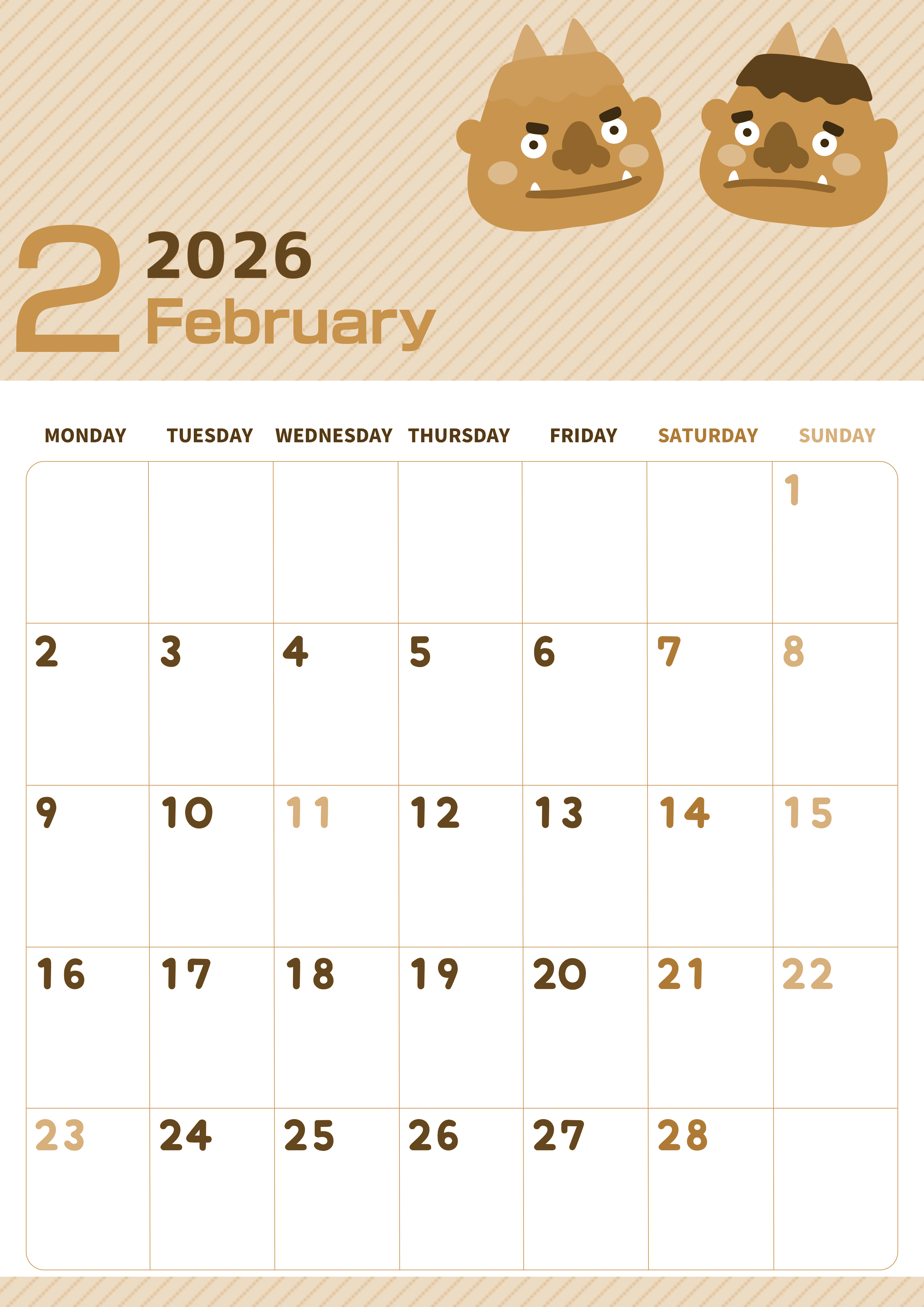 2026年2月縦型レトロな月曜始まりの無料テンプレートセピア調カレンダーです。月曜始まりなので勉強で多忙な学生さんにとって非常に使い勝手の良いセピア調カレンダーです。イラストもシンプルでありつつもかわいいのでおすすめです。(2026-00610211)