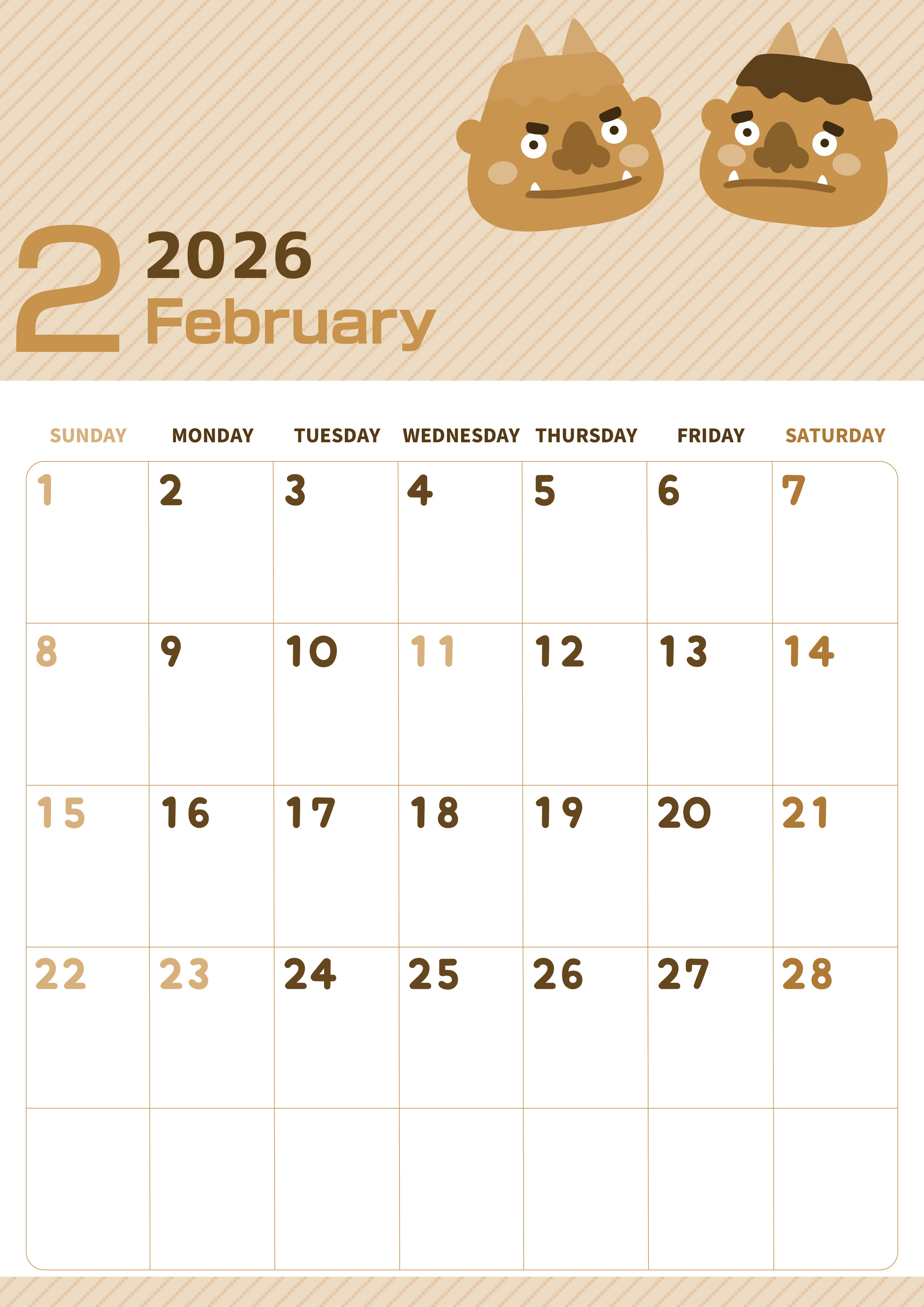 2026年2月縦型レトロな日曜始まりの無料テンプレートセピア調カレンダーです。シンプルさとかわいいテイストをバランスよく取り入れたイラストです。セピア調カレンダー部分は白紙なのでタスク管理がしやすく見やすいフリー素材です。(2026-00610210)