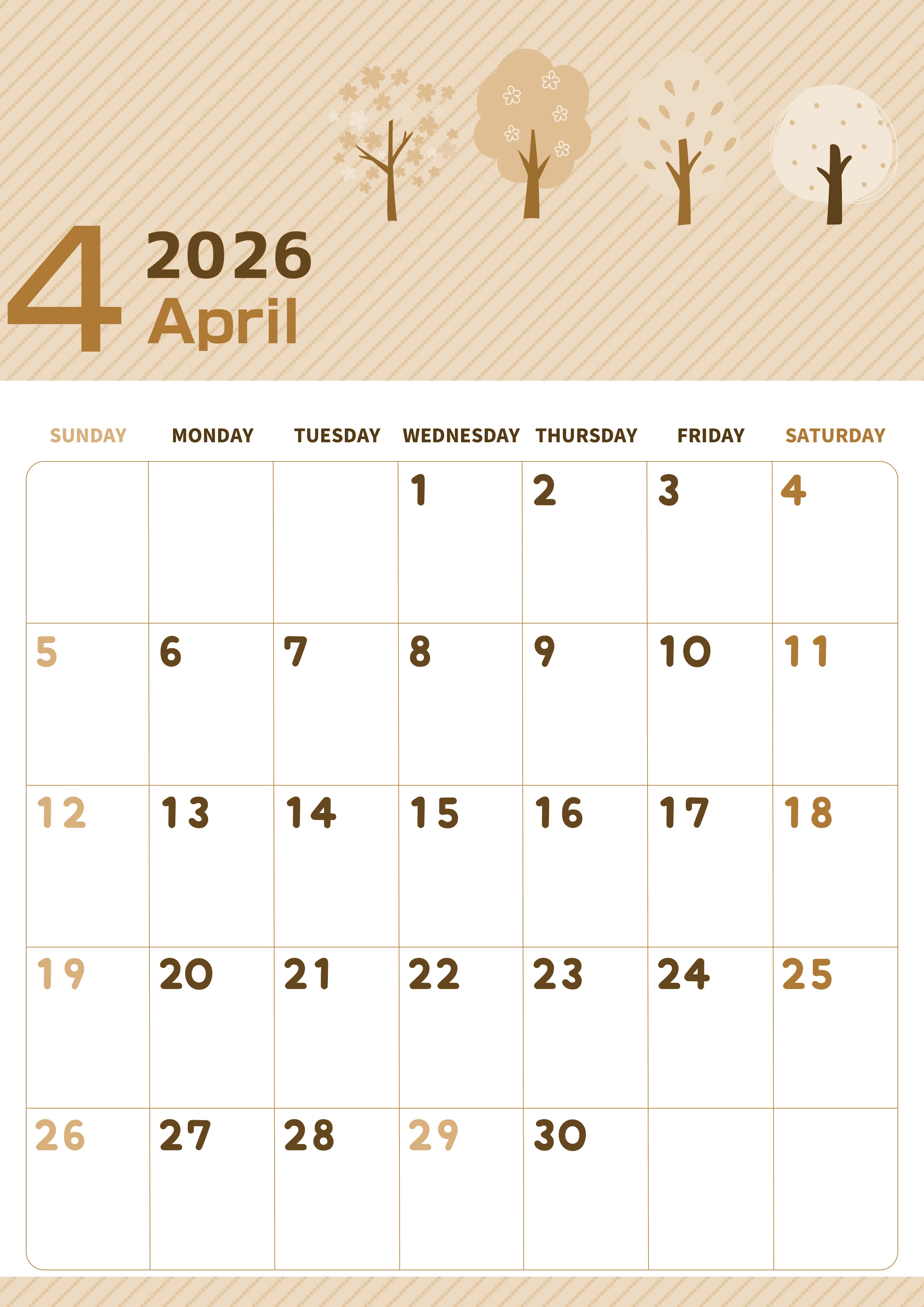 2026年4月縦型レトロな日曜始まりの無料テンプレートセピア調カレンダーです。桜木がにょきにょきと生えている様子に生命の息吹を感じるようなセピア調カレンダーです。かわいいイラストなだけでなく曜日の文字が色分けされているので実用的です。(2026-00610410)