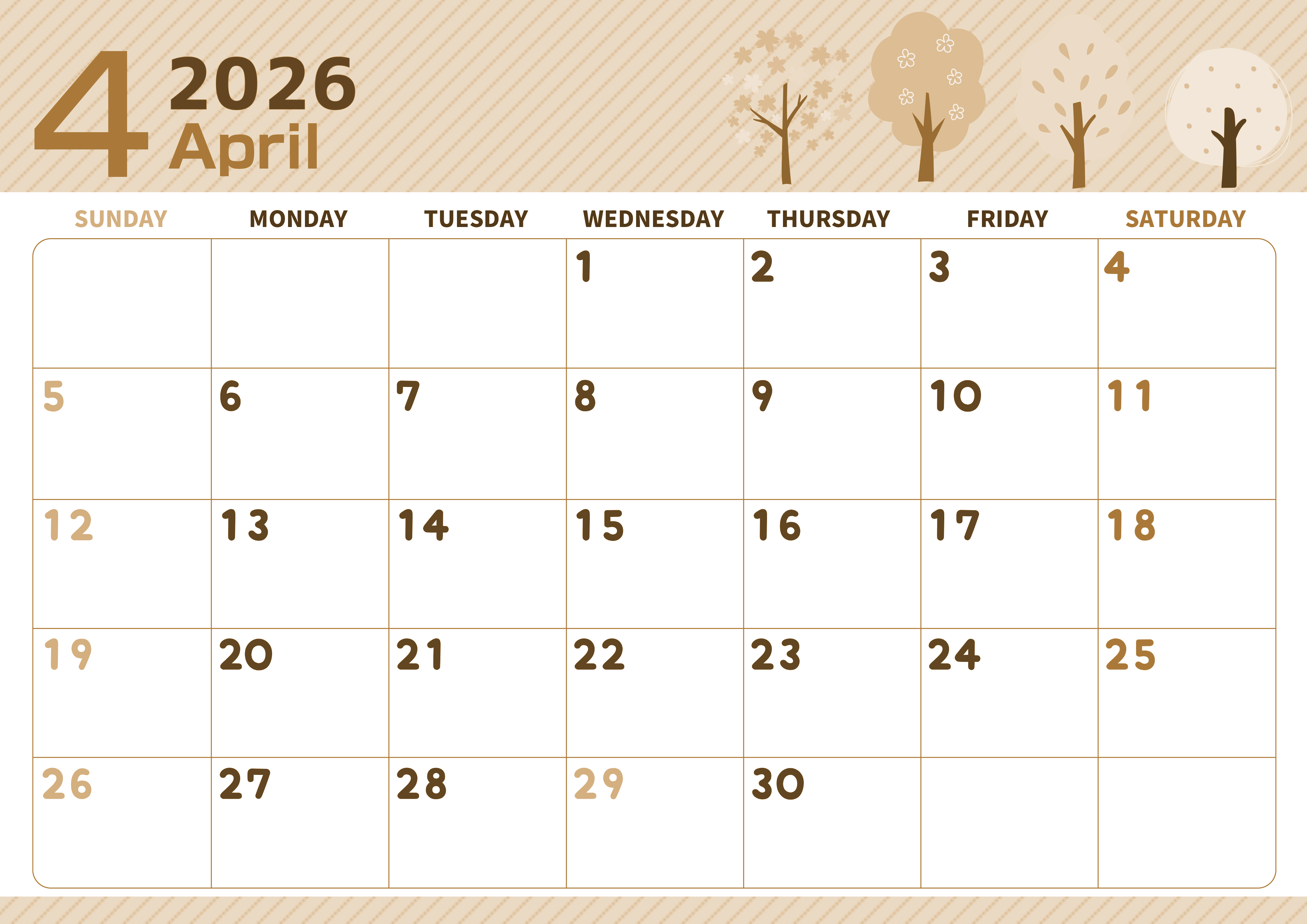 2026年・無料のカレンダーテンプレート 2026年4月横型レトロな日曜始まり 桜木イラストのかわいいA4無料セピア調カレンダー(2026-00610400) 素材状デザイン王 2025年4月2日 2026年4月横型レトロな日曜始まりの無料テンプレートセピア調カレンダーです。ストライプを背景に桜木が立ち並んでいるかわいいイラストが春を思わせてくれるセピア調カレンダーとなっています。(2026-00610400) 4月 横型のカレンダー 日曜始まり セピア カレンダーデザイン-0061