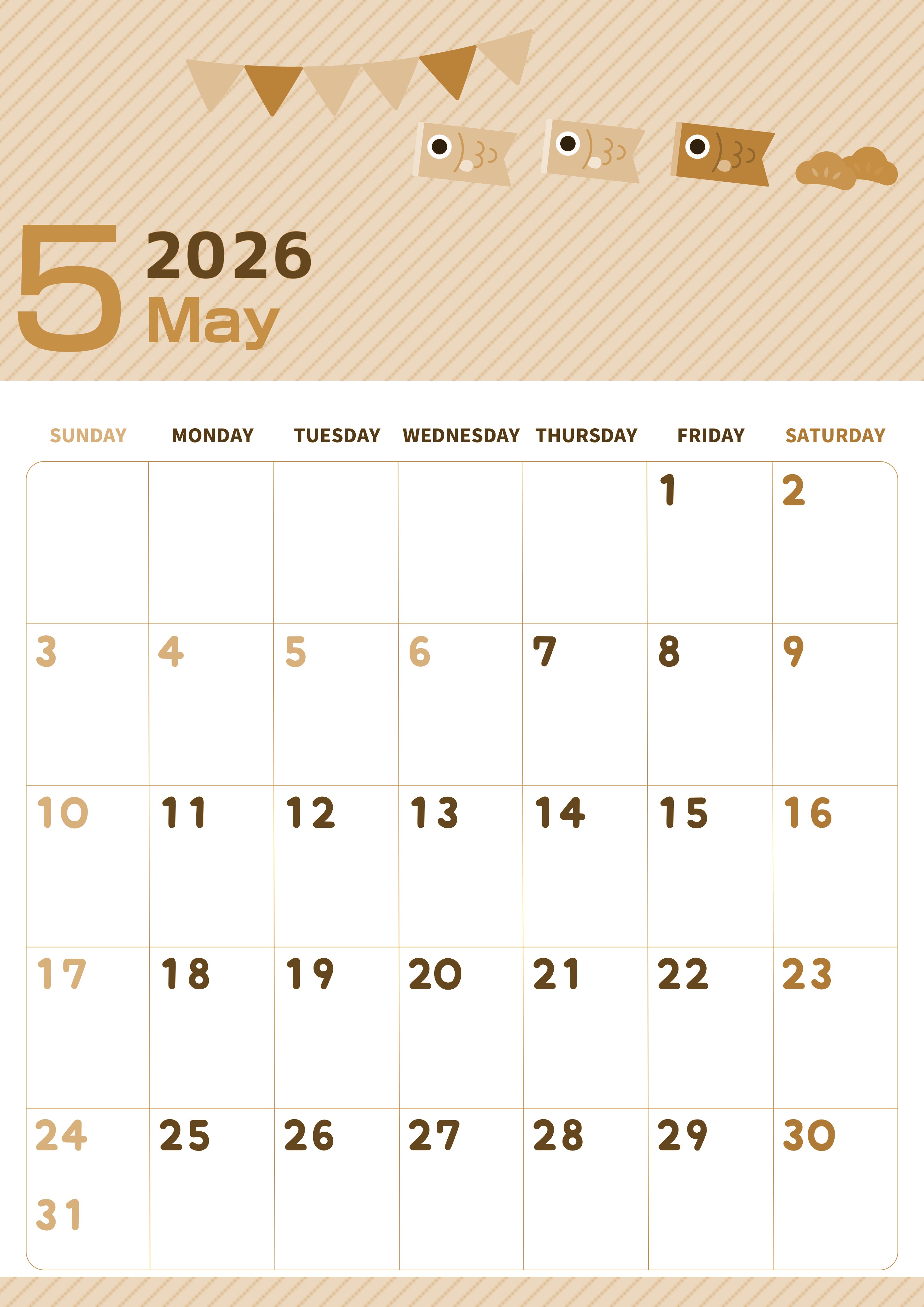 2026年5月縦型レトロな日曜始まりの無料テンプレートセピア調カレンダーです。鯉のぼりのイラストがポップでかわいいフリー素材です。家族でも個人でも使いやすいセピア調カレンダーなので無料ダウンロードをしてご利用下さい。(2026-00610510)