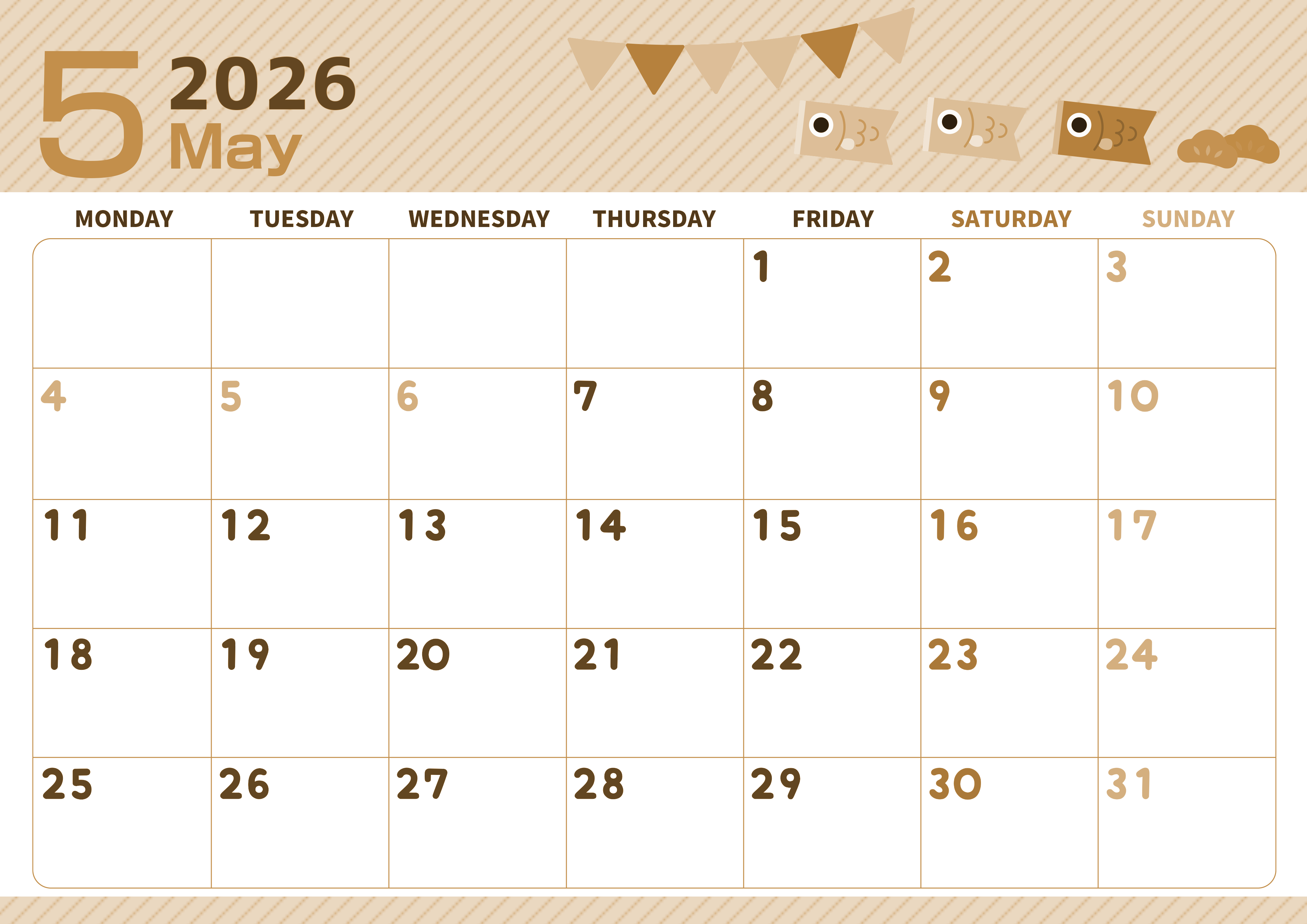 2026年5月横型レトロな月曜始まりの無料テンプレートセピア調カレンダーです。月曜始まりセピア調カレンダーに使い慣れているという方におすすめなフリーフォーマットとなっています。鯉のぼりがふわふわと空に浮いているイラストがかわいいです。(2026-00610501)