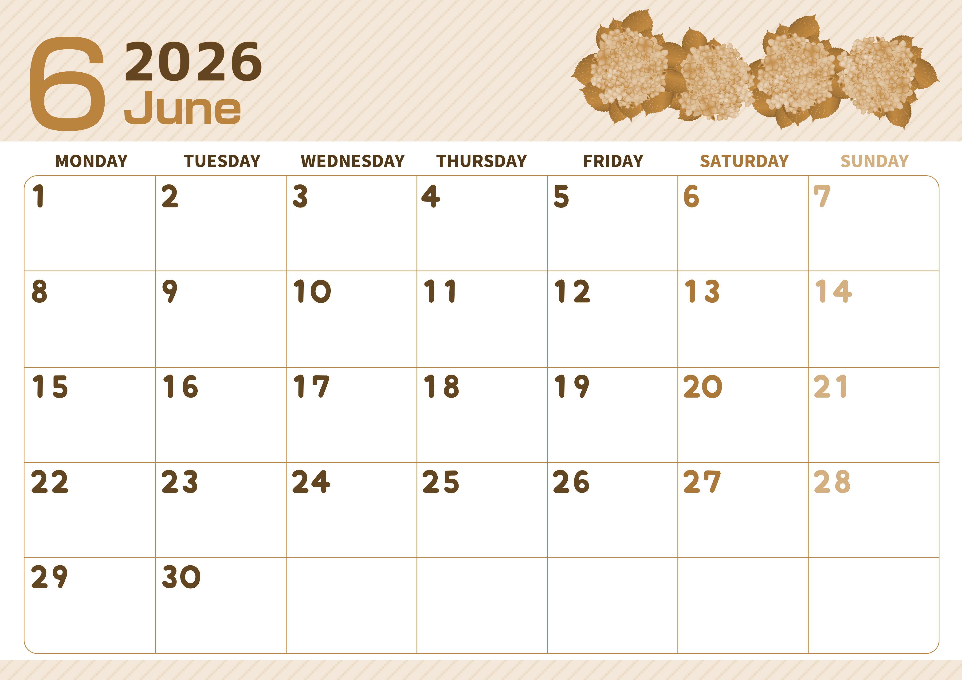 2026年6月横型レトロな月曜始まりの無料テンプレートセピア調カレンダーです。季節の花のアジサイに癒されるようなセピア調カレンダーイラストです。デザインは全体的にスタンダードでありながらかわいいポイントもあります。(2026-00610601)