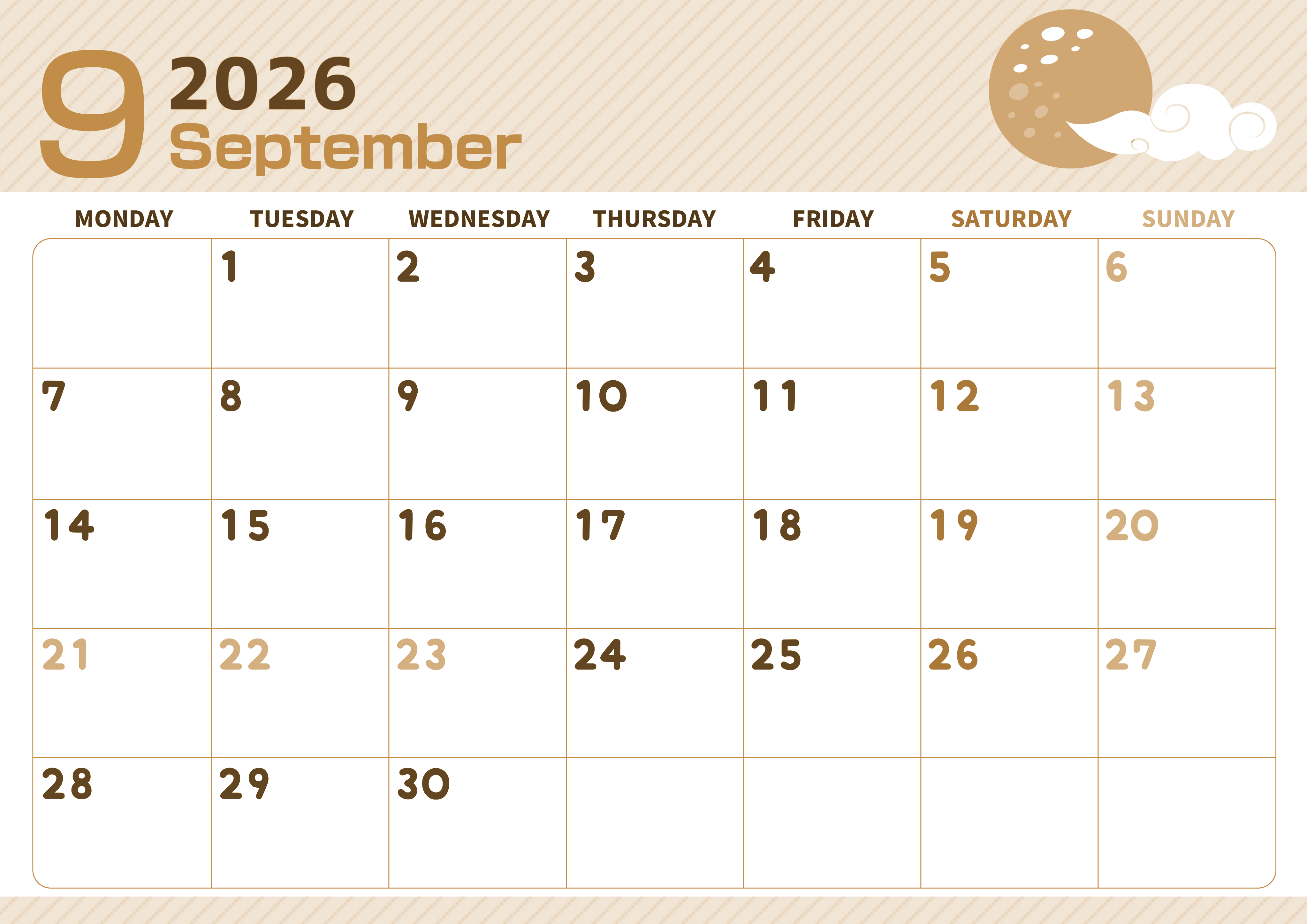 2026年9月横型レトロな月曜始まりの無料テンプレートセピア調カレンダーです。ストライプをバックに満月のイラストのコントラストが目に優しいかわいい雰囲気でシンプルな月曜始まりセピア調カレンダーに仕上がっています。(2026-00610901)