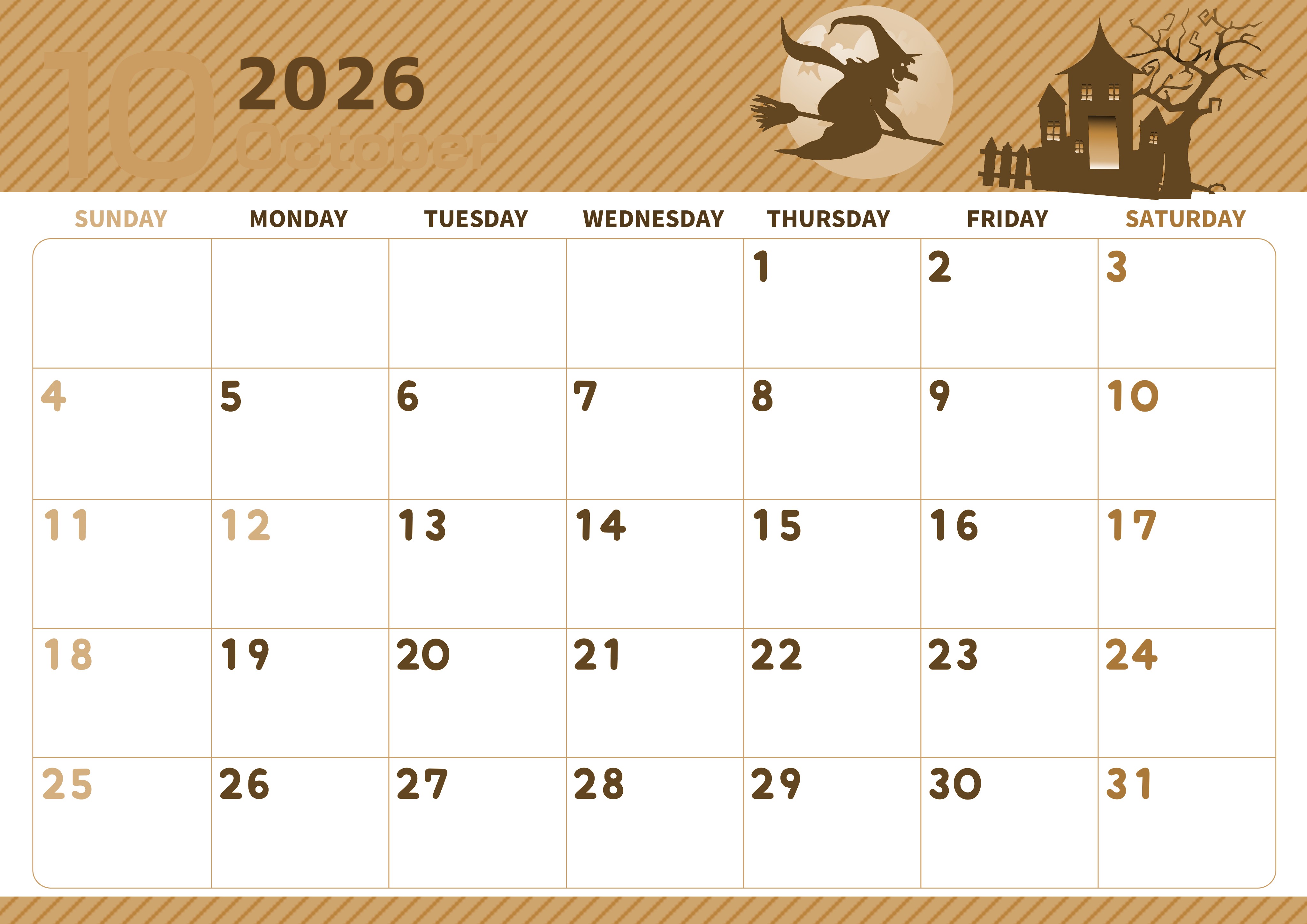 2026年・無料のカレンダーテンプレート 2026年10月横型レトロな日曜始まり お屋敷イラストのかわいいA4無料セピア調カレンダー(2026-00611000) 素材状デザイン王 2025年4月2日 2026年10月横型レトロな日曜始まりの無料テンプレートセピア調カレンダーです。お屋敷が丁寧に描かれていてシルエット調なので遊び心があります。背景との組み合わせがかわいいイラストです。(2026-00611000) 10月 横型のカレンダー 日曜始まり セピア カレンダーデザイン-0061