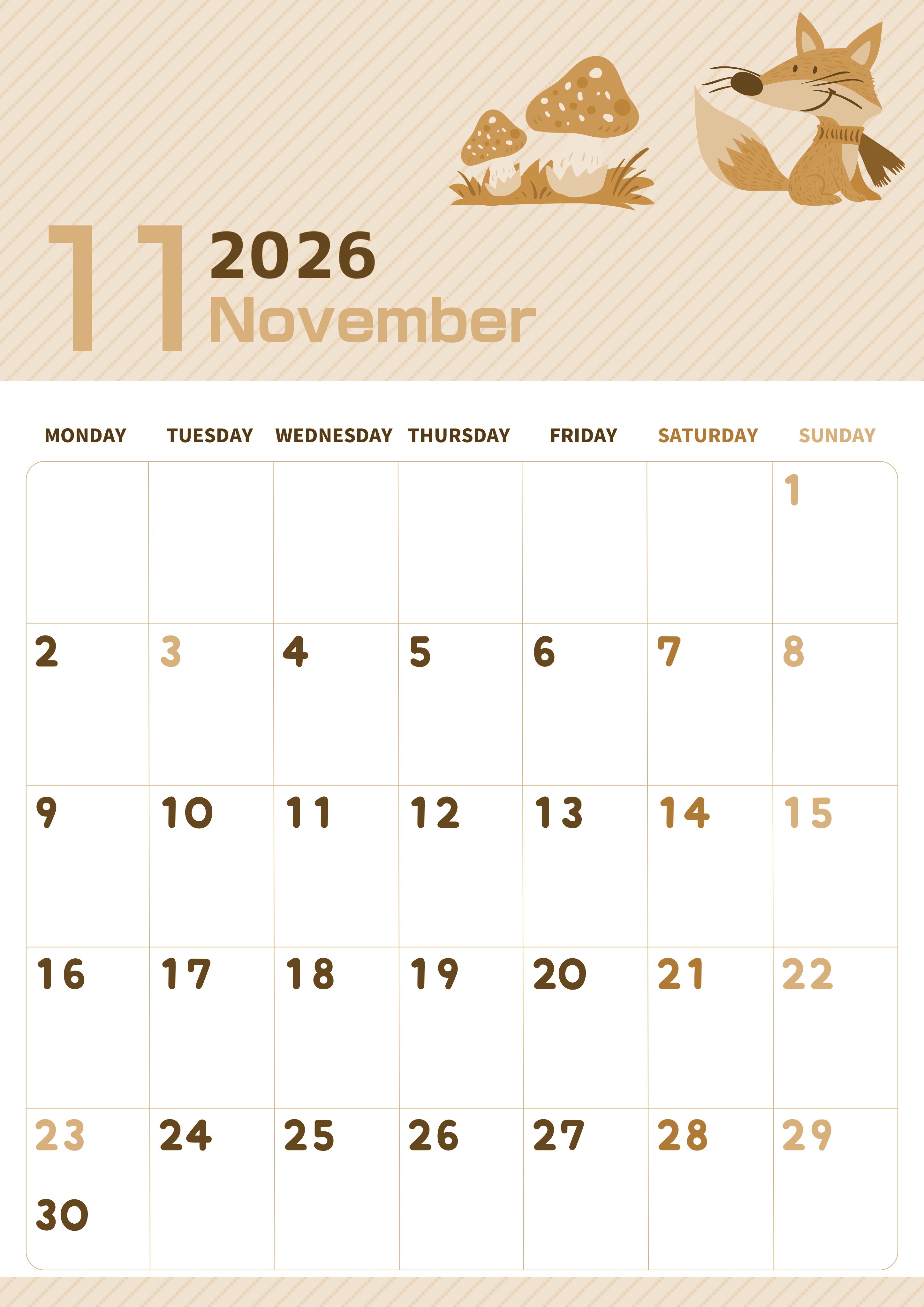 2026年11月縦型レトロな月曜始まりの無料テンプレートセピア調カレンダーです。小動物をモチーフにしたイラストがかわいいので計画を立てるのがとてもワクワクする前向きに忙しい時期を乗り越えられるフリー素材です。(2026-00611111)