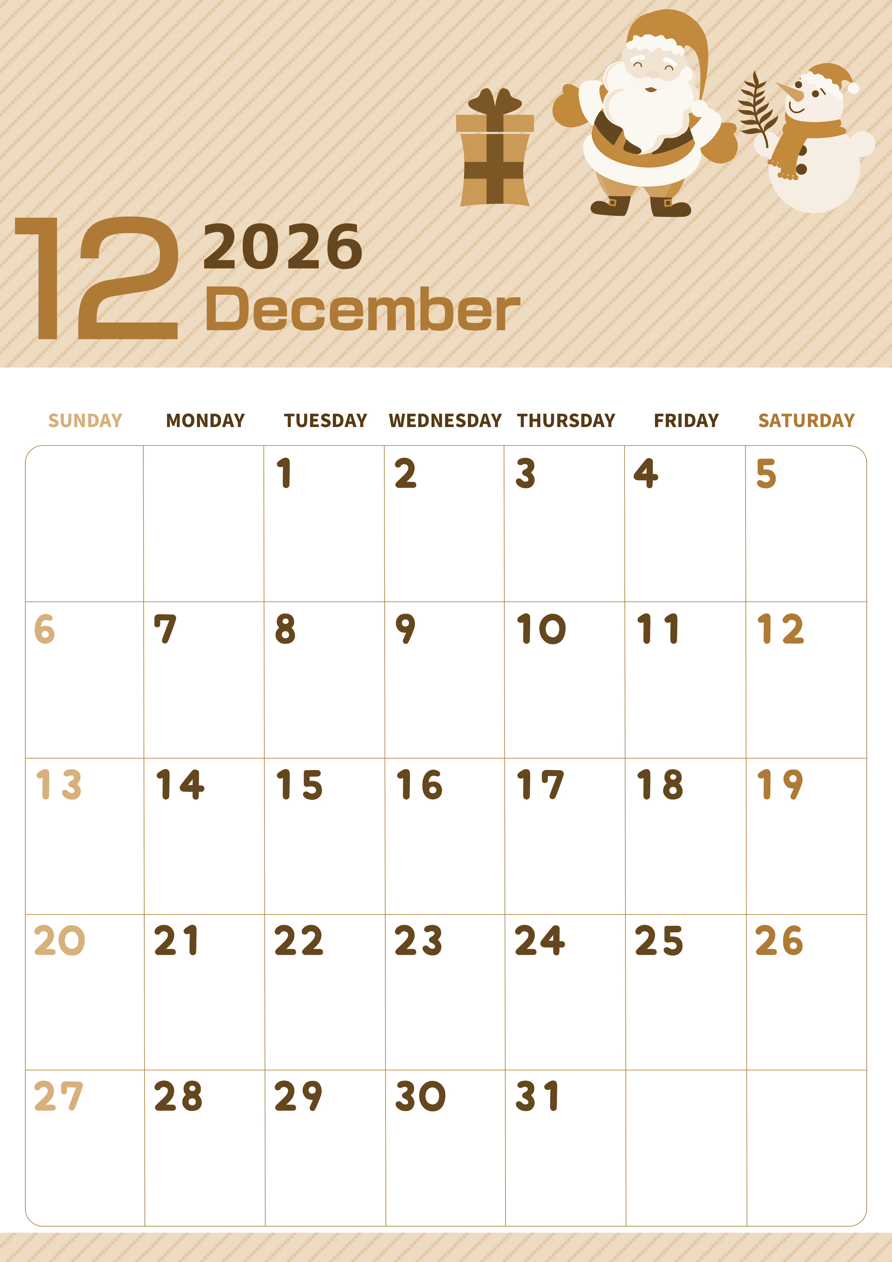 2026年12月縦型レトロな日曜始まりの無料テンプレートセピア調カレンダーです。行事モチーフのイラストに心がワクワクするようなかわいいテイストです。余白も罫線も見やすいように配置をしているので実用性も高いです。(2026-00611210)