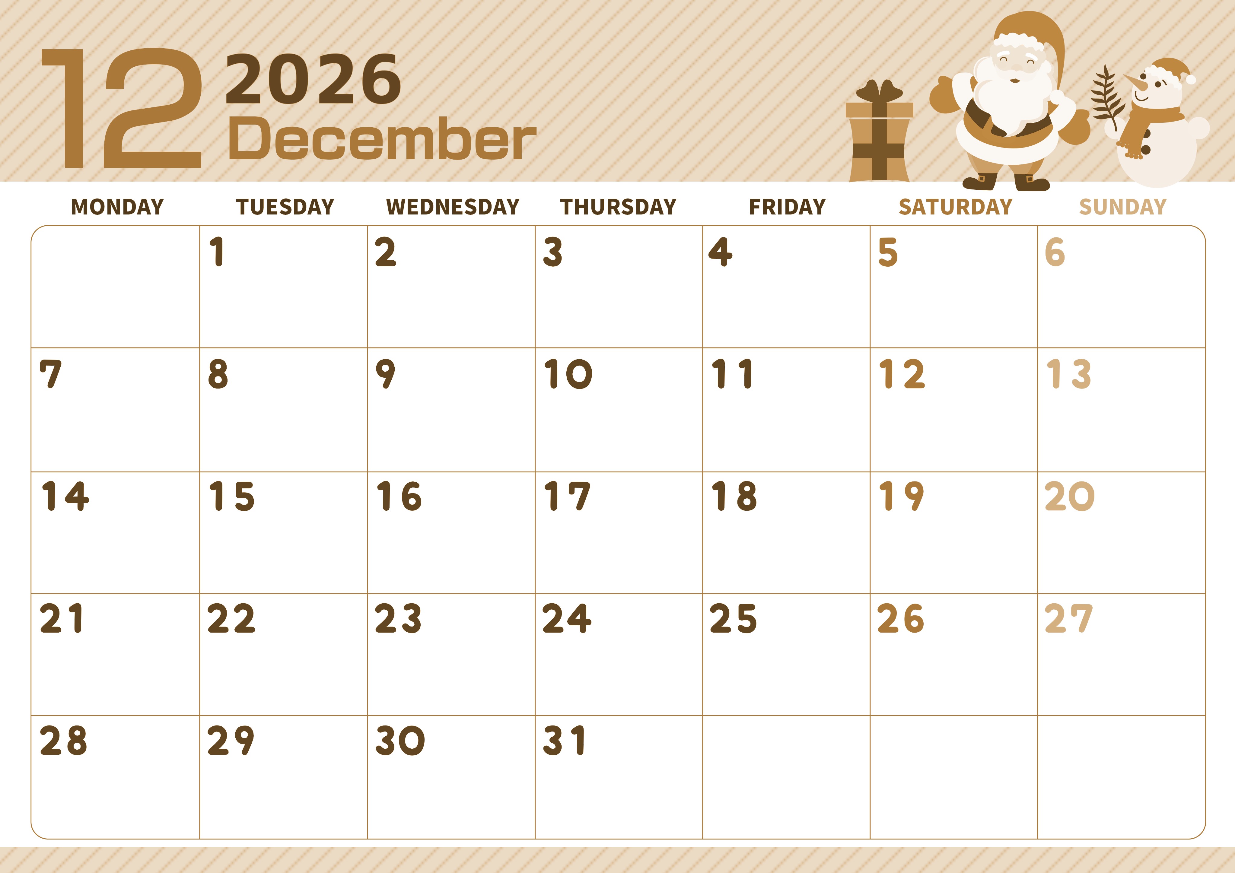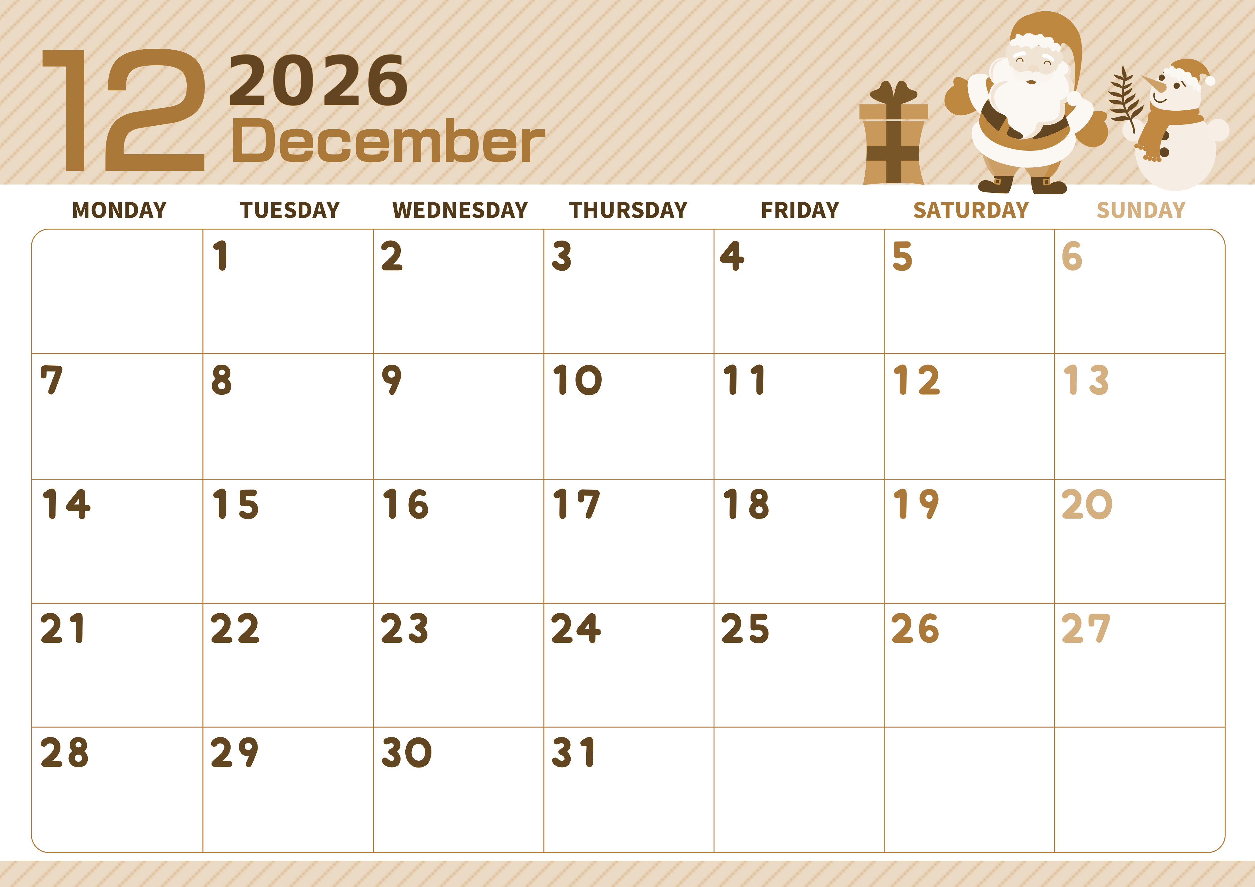 2026年12月横型レトロな月曜始まりの無料テンプレートセピア調カレンダーです。12月の行事を題材に描いたイラストです。数字のフォントがグミのようにふにゃふにゃしていてかわいいだけでなく月曜始まりで使い勝手が良いです。(2026-00611201)
